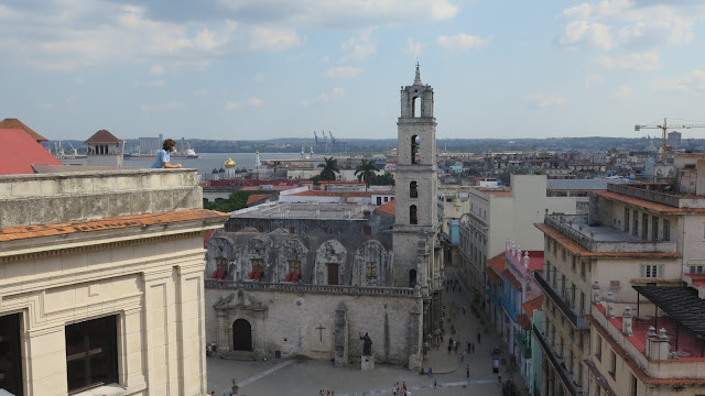 Abandonamos la compañía de la comparsa para caminar hasta la cercana Plaza de San Francisco de Asís, puerta de entrada a La Habana para aquellos que llegan en crucero. Nos asomamos al edificio de la Lonja del Comercio, para admirar la arquitectura de su interior (nada llamativo, la verdad). Al entrar, el joven recepcionista nos indica que podemos ascender a la terraza de la 6ª planta para tener unas buenas vistas del centro, previo pago de 1 CUC. Aunque nos parece algo sospechoso este cobro, accedemos a tomar el ascensor para contemplar la plaza desde lo alto. Nada espectacular, aunque las vistas son amplias puesto que estamos en uno de los edificios más altos de esta zona de La Habana.