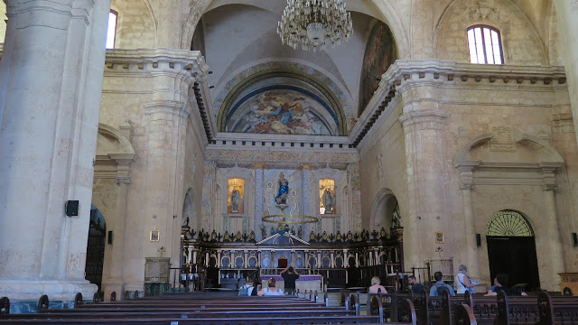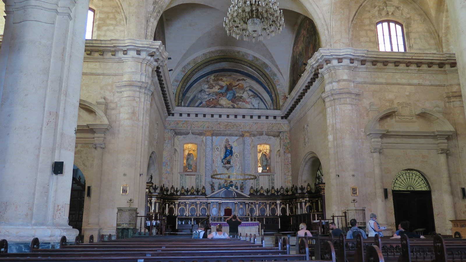 Decidimos regresar a la Habana Vieja, en concreto a la Plaza de la Catedral. Ayer estaba cerrada, pero hoy podemos visitar el hermoso edificio de fachada barroca. Su interior, por el contrario, es bastante austero, aunque resulta interesante. Como dato curioso, recordamos que en esta catedral permanecieron los restos de Cristóbal Colon desde 1795 a 1898, en que se trasladaron a Sevilla.