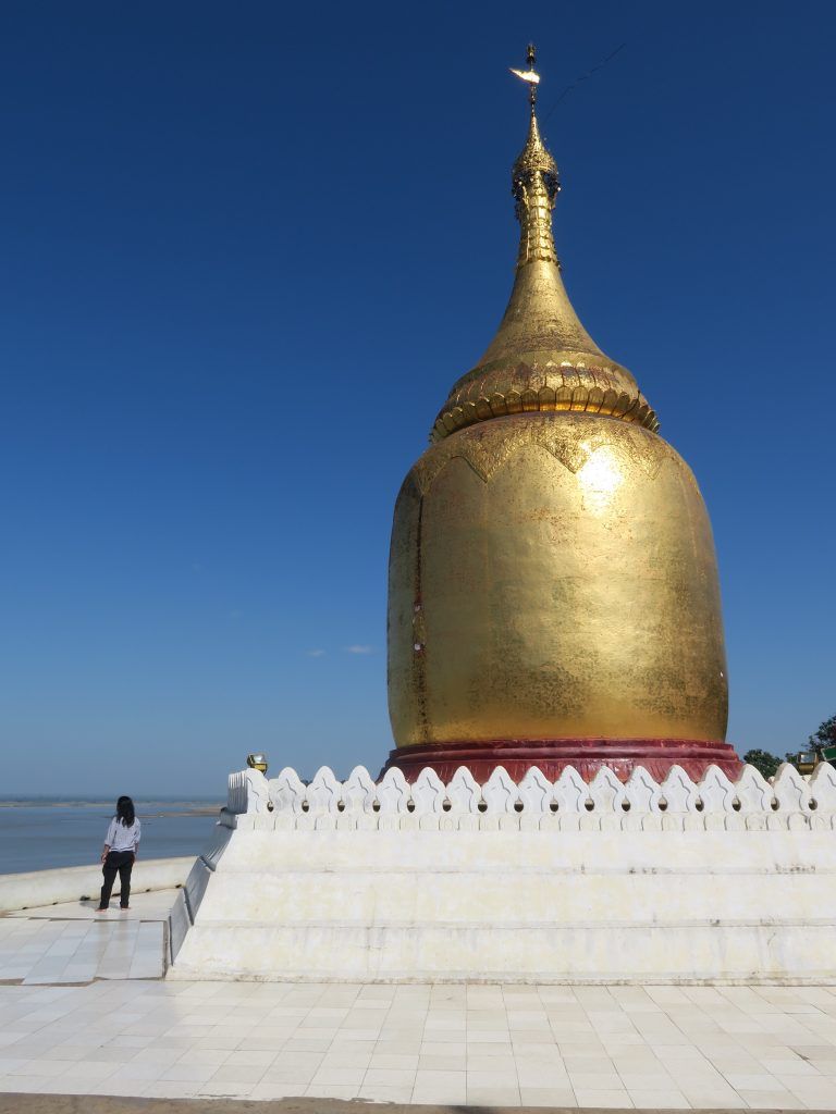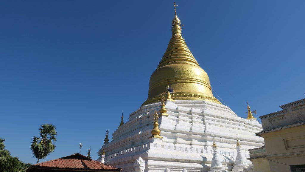 Desde este lugar vemos una gran estupa de forma cilíndrica y característico color blanco, culminada por una decoración dorada. Es la Pagoda Shewsandaw, con sus características cinco terrazas de ladrillo. Antaño se podía ascender hasta la parte superior para contemplar el atardecer; en el momento actual está prohibido subir a ella. En el recinto de la pagoda también hay un enorme Buda tumbado; cuesta un poco encontrar la entrada al edificio en el que se resguarda, pero sorprende descubrir su gran tamaño.