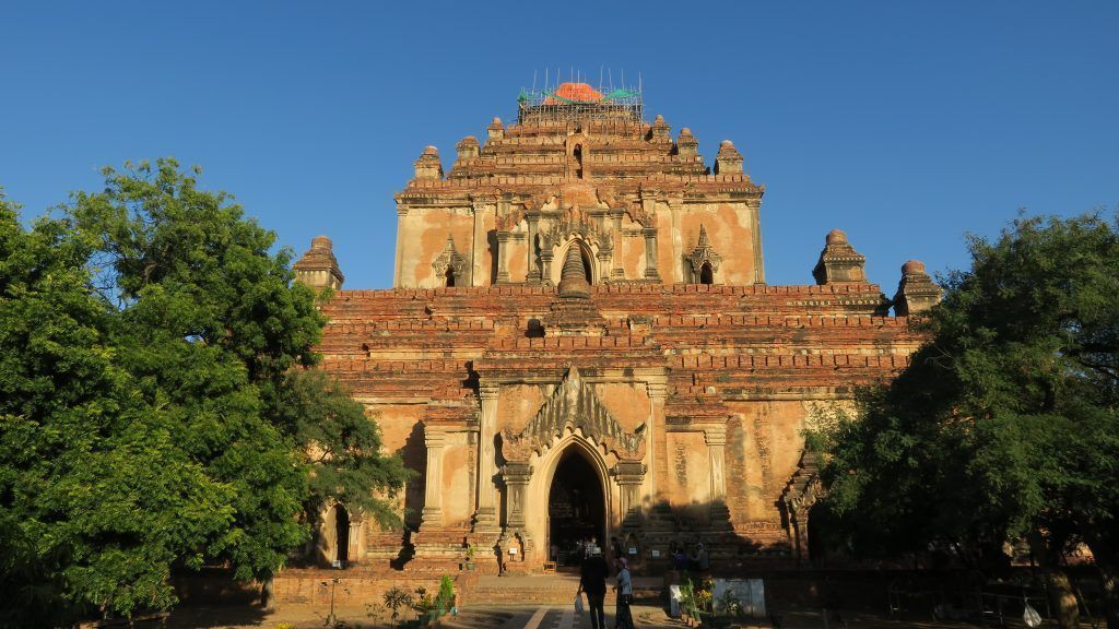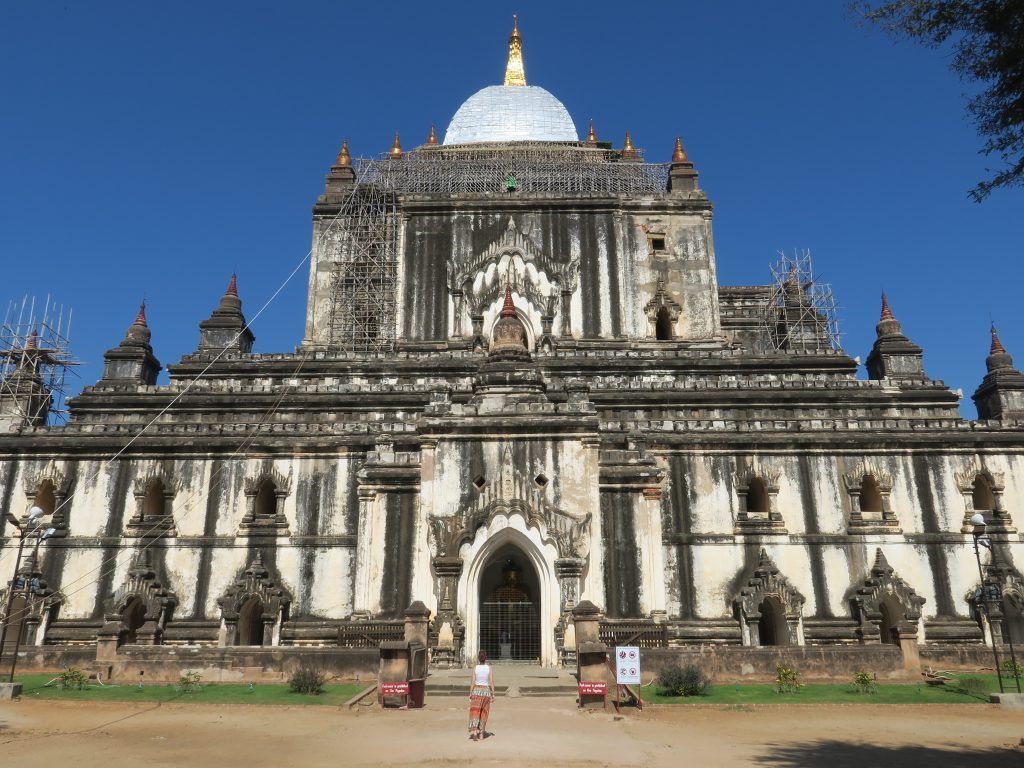 Tras una breve parada para contemplar la Pagoda Shwegu Gyi, llegamos a uno de los templos más importantes de Bagan: el Templo Thatbyinnyu. Aunque su ornamentación es más discreta que otros, su imponente altura (61 metros, el más alto de todo Bagan) llama la atención. Algunos andamios nos indican que están restaurándolo, e impresiona de que una vez limpio y arreglado volverá a su esplendor original.