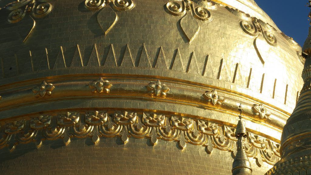 Una vez llegamos a la ciudad nos topamos con una gran pagoda, de 54 metros de altura: se trata de Gaw Daw Palin. Por fuera resulta espectacular, aunque por dentro no es de las más llamativas. Es la primera pagoda en la que encontramos otros visitantes, fundamentalmente birmanos, y que se detienen a saludarnos y tomarse fotos con nosotros continuamente.