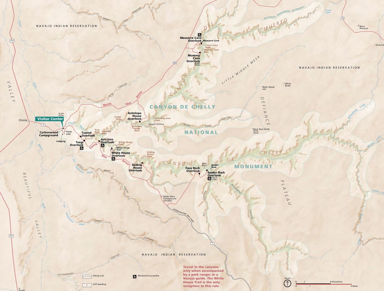 El parque pertenece a los navajo, y la entrada es gratuita. Desde el Centro de Visitantes, donde nos ofrecen un práctico mapa, parten dos pistas (North Rim Drive y South Rim Drive) que se pueden recorrer en vehículo propio. A lo largo de la ruta existen numerosos miradores con vistas sobrecogedoras del cañón, que tiene más de 300 metros de profundidad en algunos puntos.