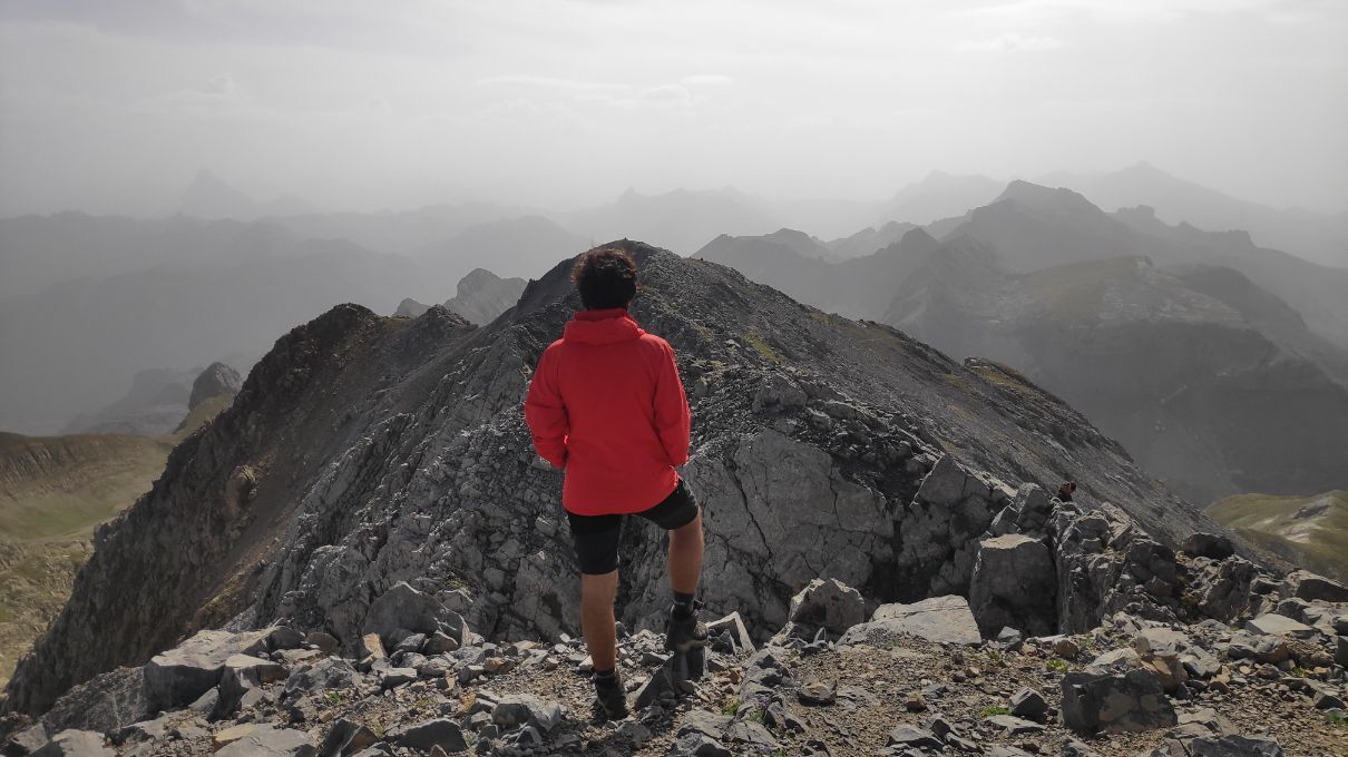 Si bien en primer plano reconocemos el recientemente conquistado Castillo d’Acher y las tierras rojas que lo rodean, el resto de cumbres son sombras difuminadas. No obstante, reconocemos algunas, como Punta Agüerri, Lenito, Peña Forca, Aspe, Mallos de Lecherín, Collarada, Anayet, Vértice de Anayet y el siempre imponente Midi d’Ossau. Grandiosas panorámicas venidas a menos por las condiciones meteorológicas.