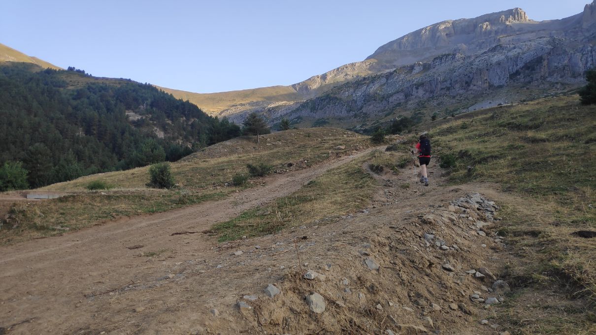 Superamos un pequeño tramo de ascenso por senda para, enseguida, desembocar en una cómoda pista que toma rumbo norte, alternando algún tramo casi llano con otros de pendiente exagerada. Empieza dura la ruta, aunque con las vistas espectaculares del Bisaurín desde mil metros más abajo el esfuerzo se lleva de otra manera.