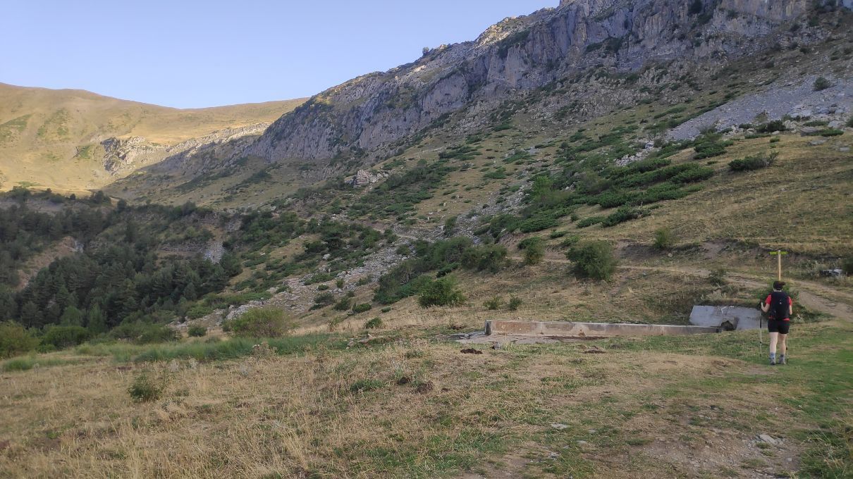 Obviamos un par de desvíos, bien señalizados, que nos llevarían al Puerto de Bernera y el Valle de los Sarrios. Nosotros continuamos por la pista que, a la altura de la fuente/abrevadero de la Fuenfría, suaviza y se abre en un bucólico terreno de prados. Sorprendemos a algunas vacas pastando, ajenas al desfile de montañeros que recorrerá su territorio en las próximas horas.