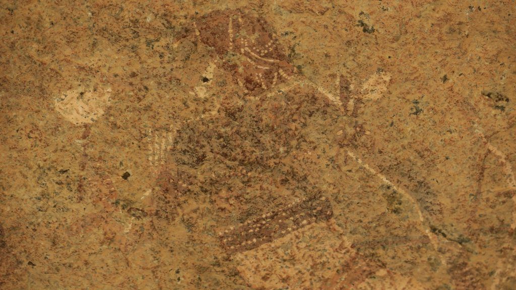 Caminamos durante unos 50 minutos, amenizados por las interesantes explicaciones de nuestra guía, hasta llegar la gran roca en la que podemos contemplar a la White Lady. Se trata de una abrigo pétreo en el que reconocemos un gran número de figuras humanas y otras tantas de animales. Parece una escena de caza, en la que destaca la popular y misteriosa White Lady.