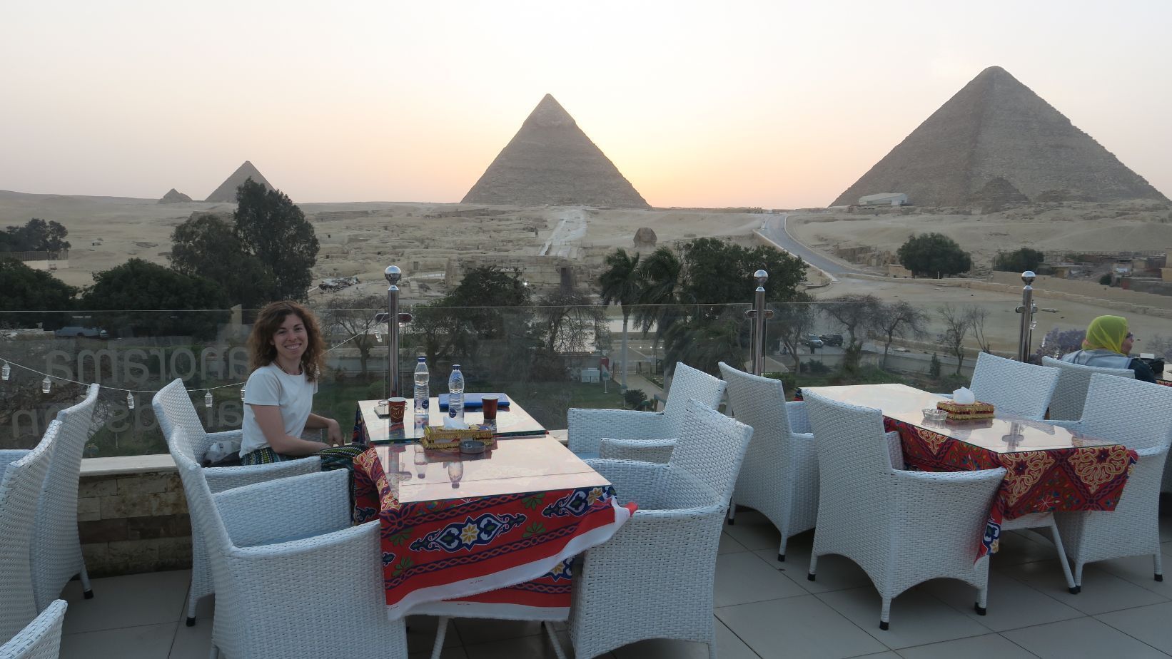 Desde el aeropuerto tomamos un Uber que, después de más de una hora y media de camino, nos lleva a nuestro hotel en Giza. Primera sorpresa: el hotel está bastante bien y, sobre todo, desde su terraza superior hay unas vistas impresionantes de las pirámides y la esfinge. Disfrutamos de un hermoso atardecer y, mientras cenamos, del espectáculo de luces y sonido que se proyecta sobre ellas (nos parece un poco “de otra época”, aunque ver las pirámides iluminadas tiene su punto).