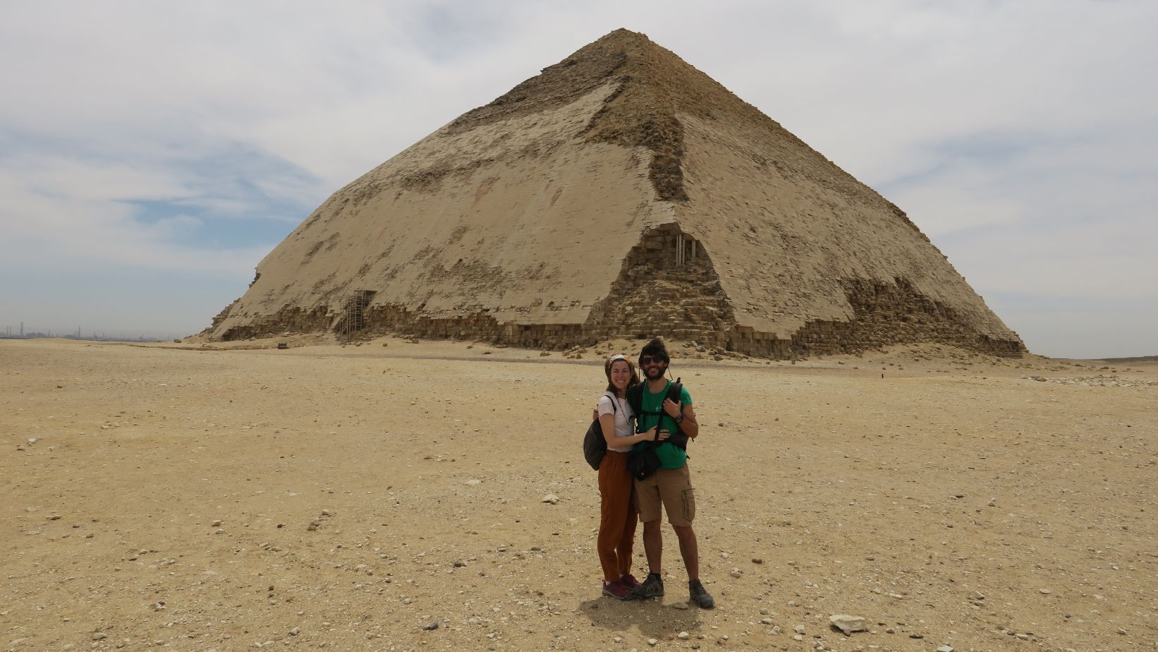 La siguiente parada es en Dahshur. En primer lugar visitamos la Pirámide Inclinada, que guarda todavía parte de su recubrimiento original. Llegamos a la entrada y nos dicen que no hay luz (ni a pesar de una pequeña propina…). Así que nos toca iluminarnos con el teléfono móvil por un interminable y claustrofóbico pasillo descendente de 70 metros. Agachados, como podemos, vamos avanzando por el interior de la pirámide hasta hallarnos sumidos en la más profunda oscuridad. Tras varios pasillos llegamos a la parte superior de la pirámide, en la que lo único que hay son decenas de murciélagos. ¡Menuda aventura!