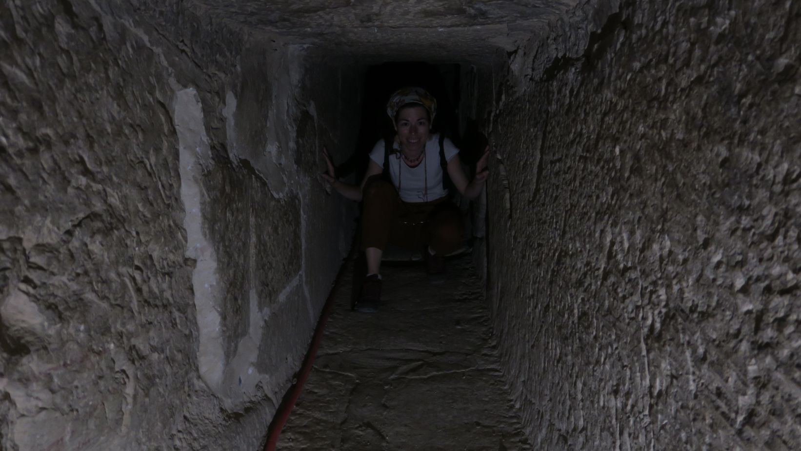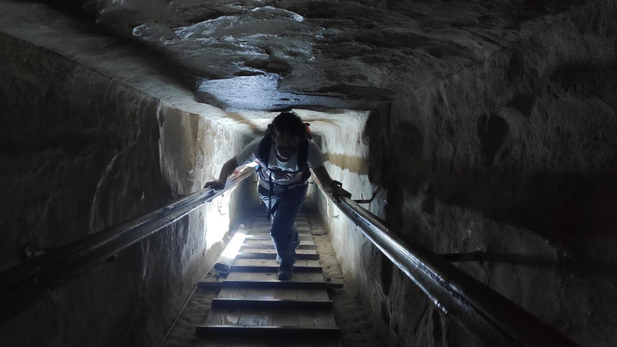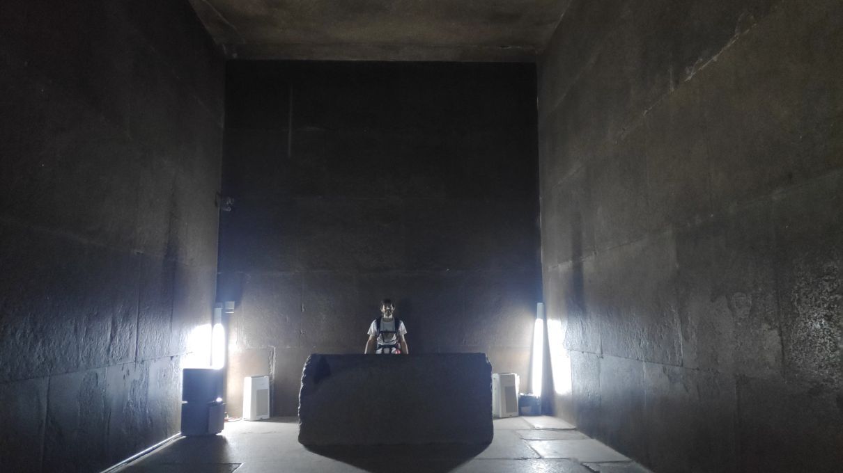 Tras detallar la Pirámide de Keops, entramos a verla. Primero descendemos unos metros hasta un pequeño descansillo; desde allí una amplia subida en la que hay que ir agachados hasta llegar a la Gran Galería, al final de la cual hay un pequeño paso hasta la Cámara del Rey. En su interior, un sarcófago de granito, sencillo y sin decoraciones. Tenemos la infinita fortuna de visitar este mágico lugar en una época en que hay muchos menos turistas en Egipto; por ello, podemos disponer de unos minutos completamente a solas en la Cámara del Rey. Silencio, momentos sobrecogedores.