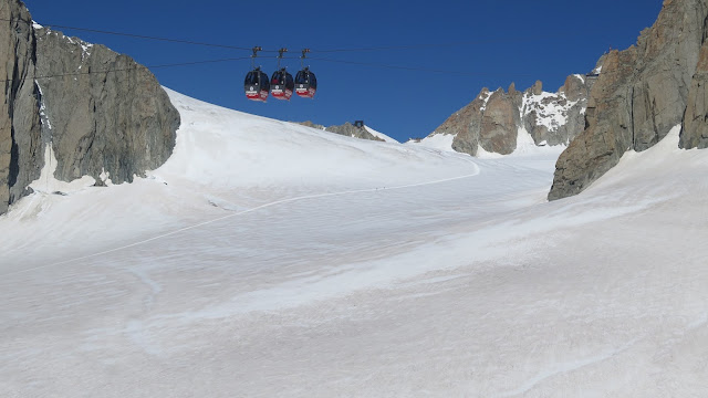 Continuamos la visita tomando un teleférico (“Mont Blanc Panoramic”) que nos lleva a la Punta Helbronner (3466 m). Son pequeñas cabinas en las que caben cuatro personas, y que surcan el cielo por encima de la Vallée Blanche y el Glacier du Géant. Tomamos tantas fotos de los glaciares, seracs, valles y montañas, que llegamos a gastar una de las baterías de la cámara.