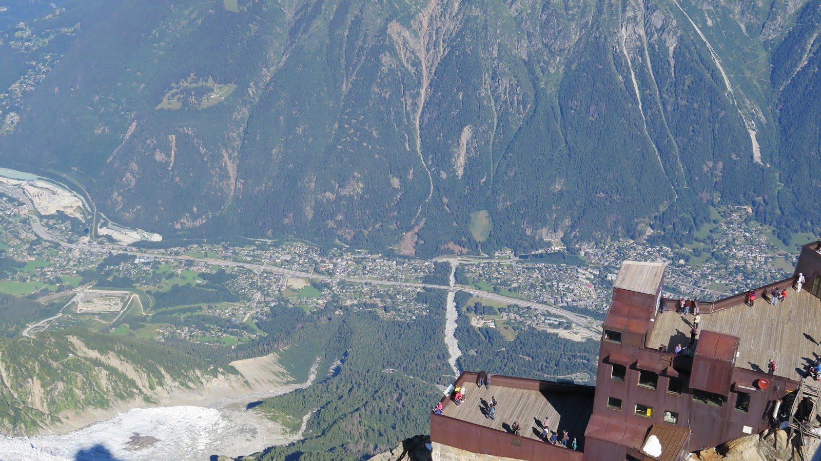 Vista desde la terraza superior, a 3842 metros de altitud. Vemos la terraza inferior y Chamonix al fondo.