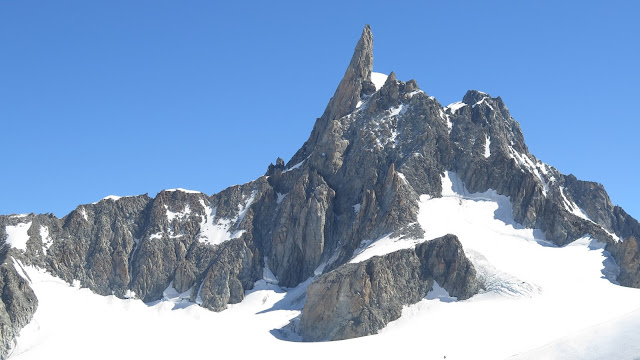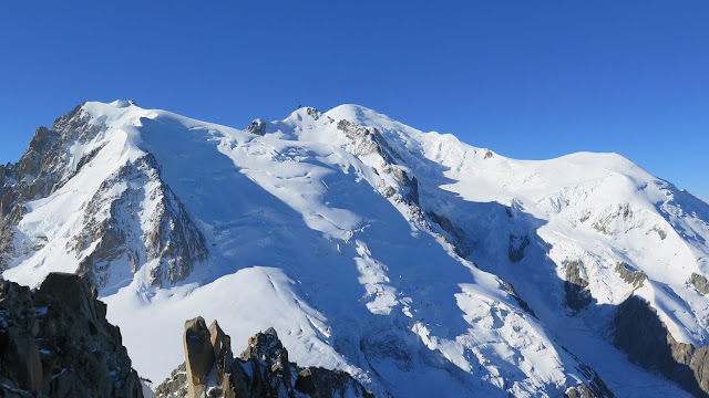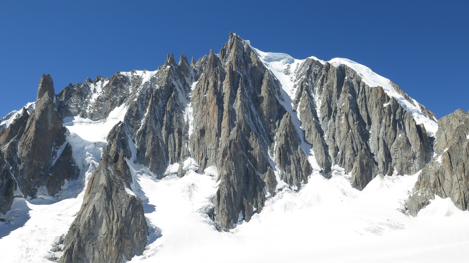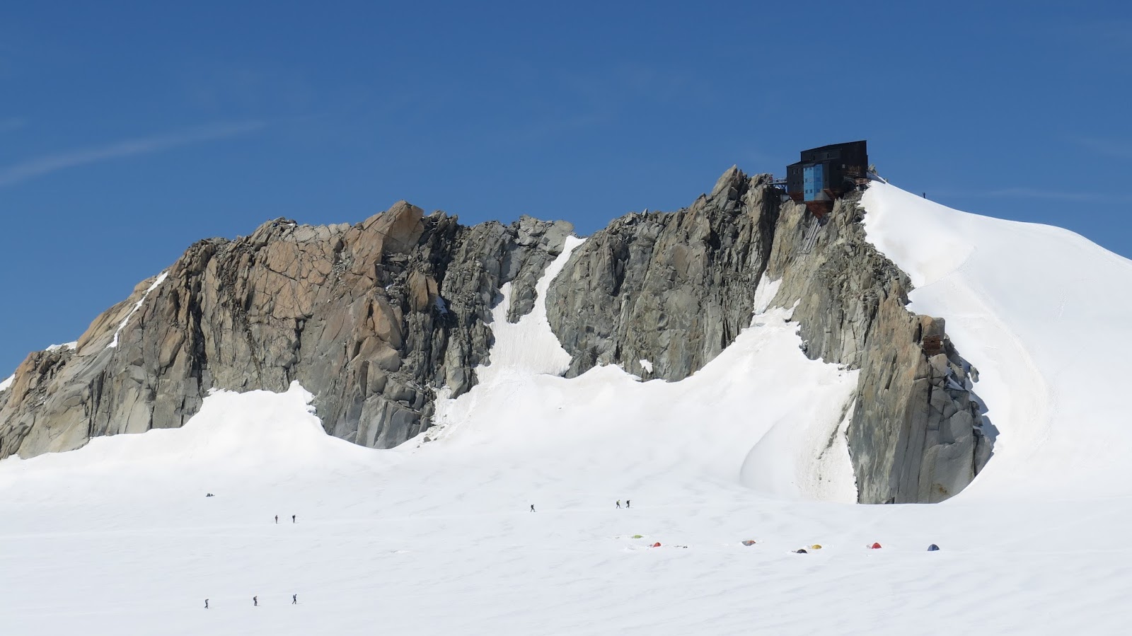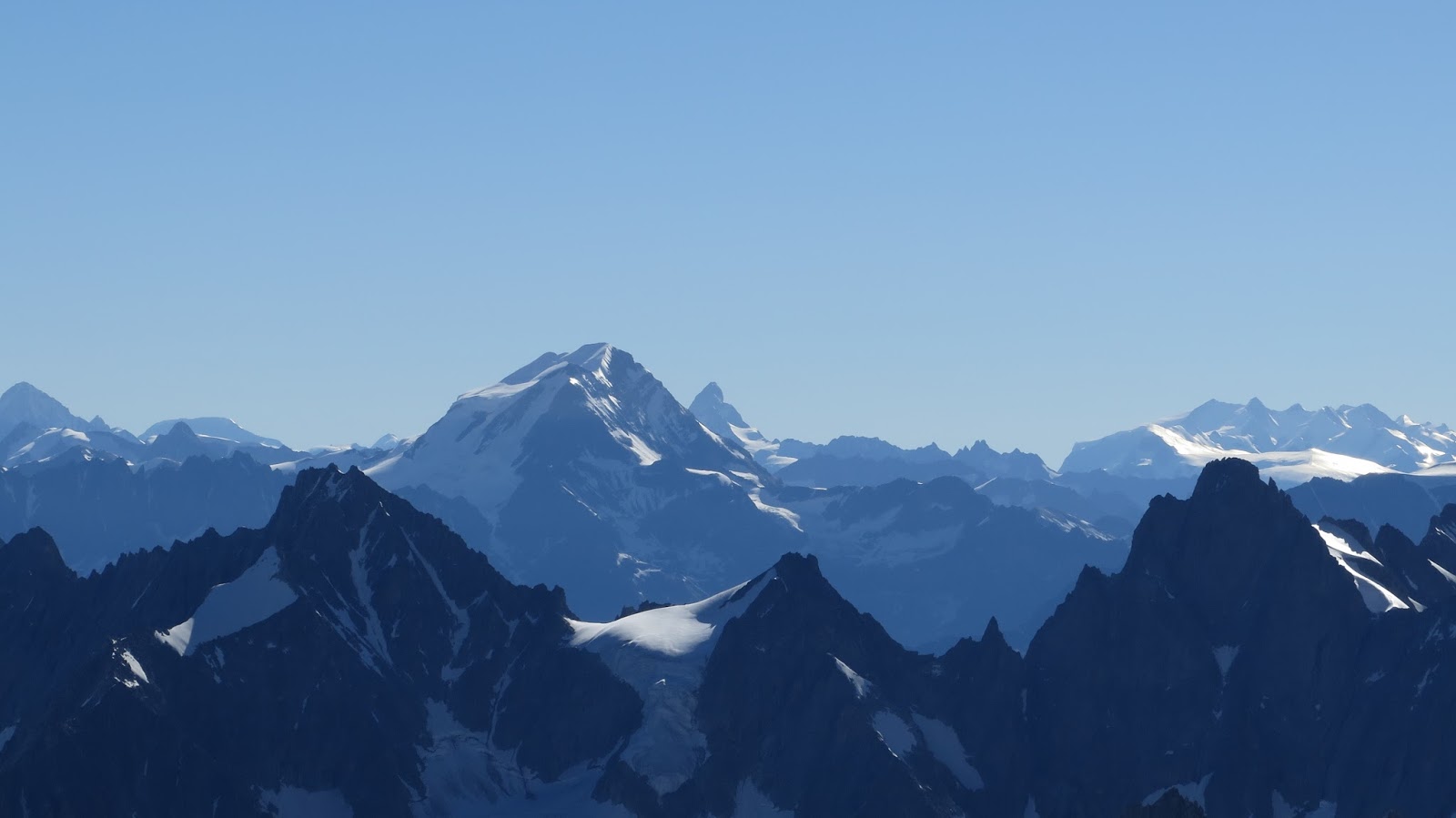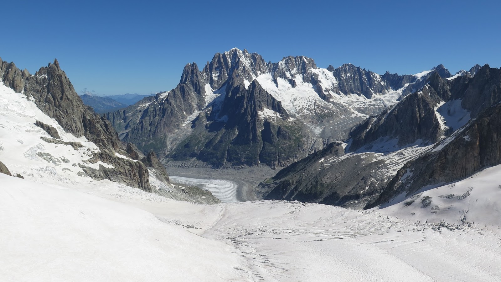 Una vez descendemos del teleférico llegamos a una pequeña terraza con unas vistas de 360º impresionantes. A nuestro alrededor podemos distinguir numerosas montañas, muchas de las cuales superan ampliamente los cuatro mil metros de altitud. Destaca el Mont Blanc, rodeado de imponentes glaciares. Mont Maudit, Mont Blanc du Tacul, Dôme du Goûter, Den du Géant, Grandes Jorasses…prácticamente al alcance de nuestras manos. Más a lo lejos reconocemos al Grand Combin, Monte Rosa e incluso el Cervino/Matterhorn. Lo más llamativo es ver a los alpinistas que inician sus rutas, bien equipados, por las nevadas aristas de la montaña en dirección a los inmensos glaciares o por la vertical Arête des Cosmiques.