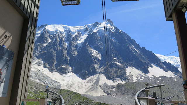 Vista atrás al recorrido realizado en teleférico. Al fondo se aprecia la Aiguille du Midi.