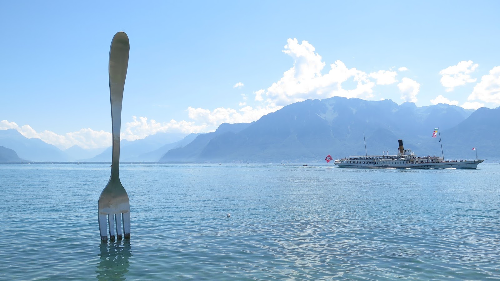 Seguimos la ruta, deteniéndonos en Vevey, una ciudad con un bonito paseo a orillas del lago Leman. Aprovechamos para comer algo y hacernos unas fotos con el lago de fondo. La ciudad es conocida por “el tenedor”, una obra de arte consistente en un tenedor de grandes dimensiones “clavado” en el lago. Enfrente de esta escultura se encuentra la estatua de Charles Chaplin, quien vivió cerca de allí unos años. Vemos, por fuera, el Alimentarium, el primer museo del mundo dedicado a la alimentación. Caminamos un poco por el animado paseo y la plaza del Mercado (con su famosa “Grenette”), antes de tomar el coche de nuevo.