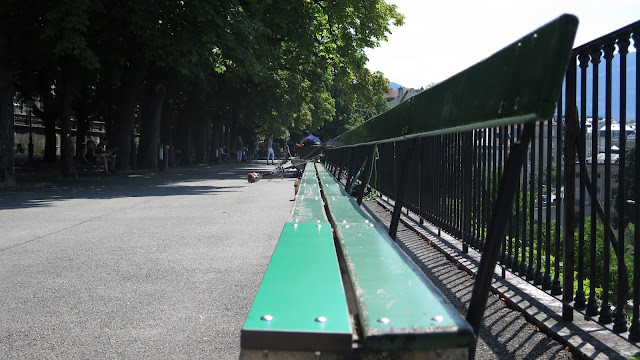 Nosotros no nos detenemos, y seguimos el paseo por la Rue de l’Hôtel-de-Ville y después por la Rampe de la Treille, donde se sitúa “el banco más largo del mundo”. De color verde, aunque tiene gracia por su tamaño, no nos parece demasiado relevante. Pero las vistas en dirección hacia el Parc des Bastions son notables.