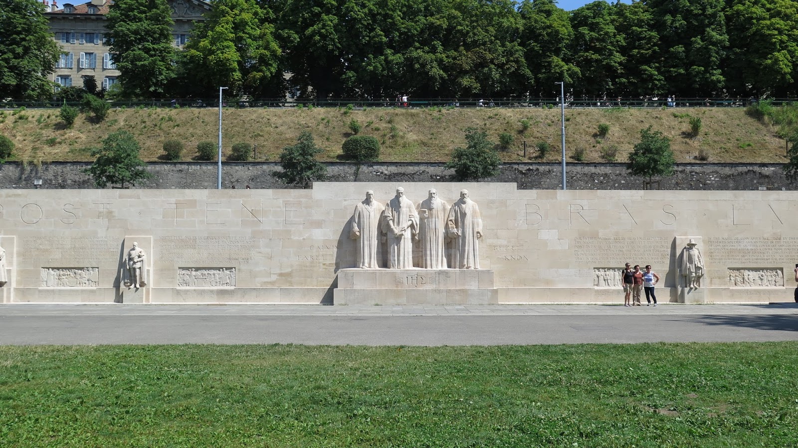 Descendemos hasta dicho parque, que se encuentra abarrotado dado el soleado día que tenemos. Paseamos por la Promenade des Bastions hasta llegar al Muro de los Reformadores, con cuatro grandes estatuas en el centro que representan a Guillaume Farel, Juan Calvino, Teodoro de Beza y John Knox.