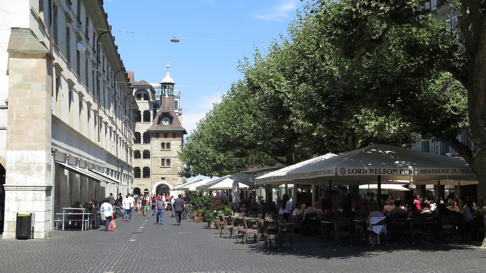 Primero pasamos por el Pont de l’île, con su bonita torre. Continuamos por la Rue de la Confédération, Place de la Fusterie y la animada Rue du Marché. Finalmente llegamos a la Place du Molard, donde los ginebrinos ya están comiendo en las numerosas terrazas.