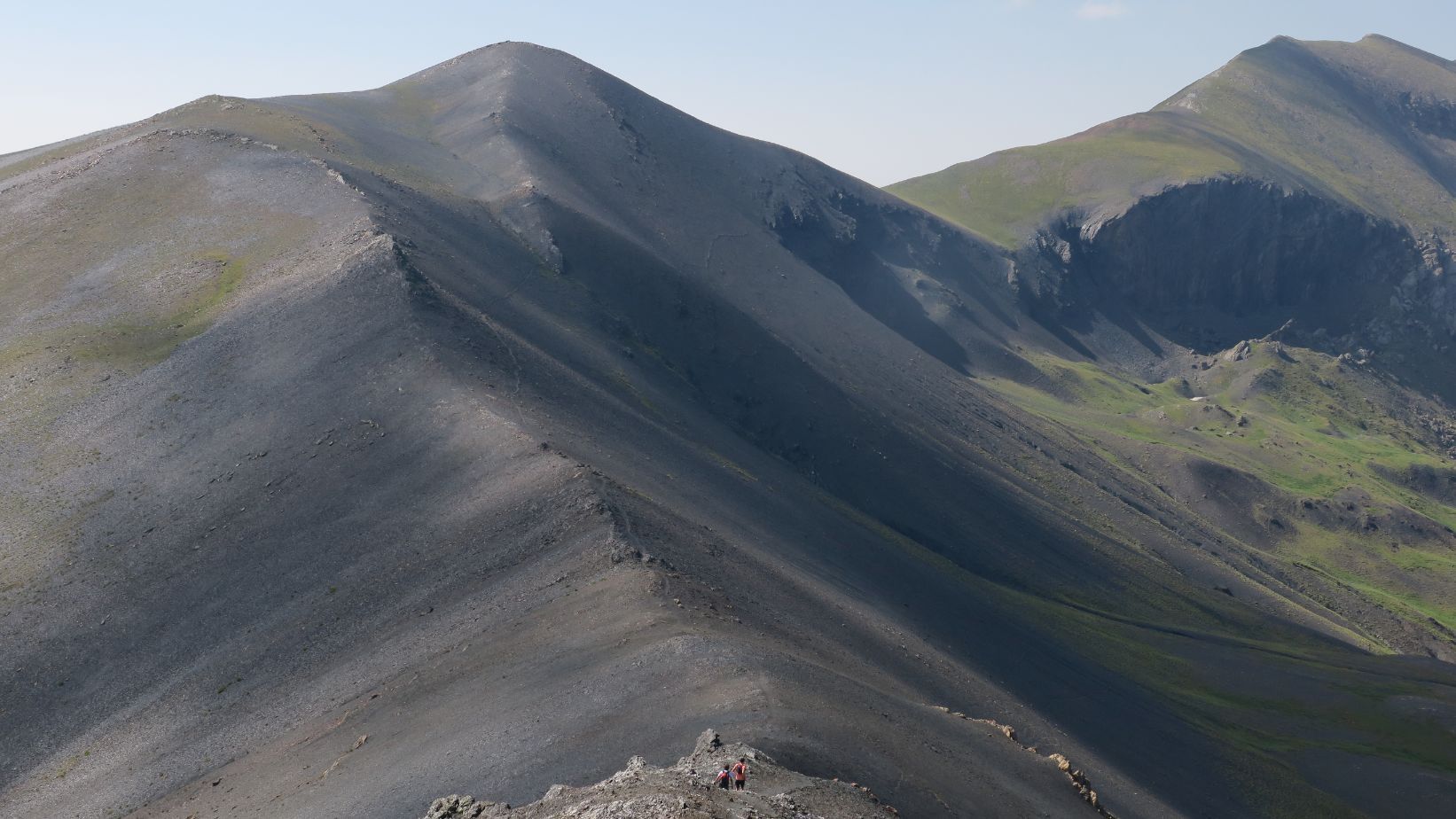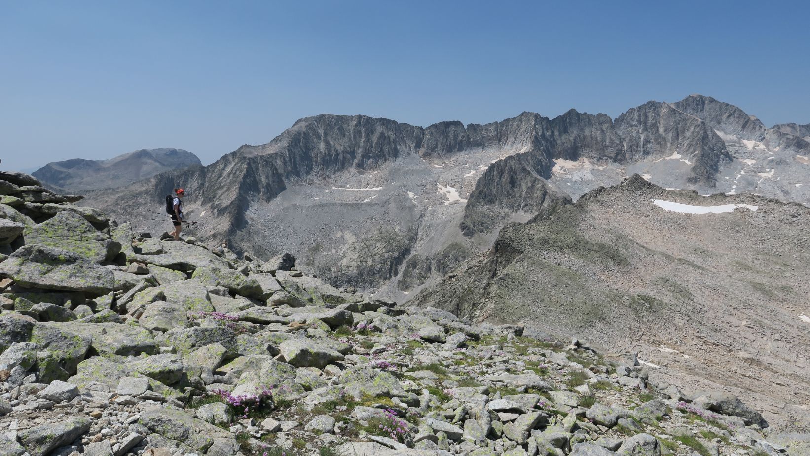 El continuo ascenso nos lleva hasta una suerte de collado, desde el cual la ruta vira al sudeste, remontando de manera más suave los últimos metros que permiten hollar la cima de Estiba Freda (2697 m) tras una hora y media de ruta. Desde allí, merece la pena recorrer la amplia cresta que nos deposita, en unos 20 minutos más, en la cumbre de Roques Trencades (2755 m).