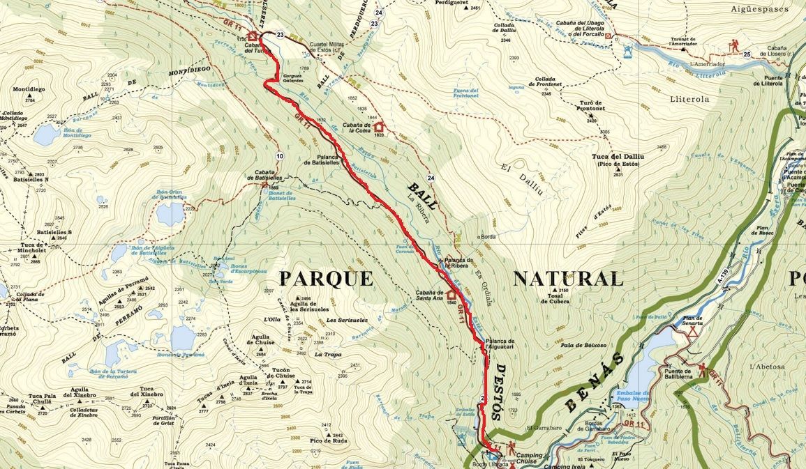 Se superan la Cabaña de Santa Ana y la Fuente de Coronas, buenos lugares donde reposar brevemente, y se continúa por la pista, que gana algo de pendiente. Sin pérdida y con buena señalización en todo momento, se siguen las indicaciones que llevan hacia al Refugio de Estós. Sin embargo, más adelante se llega a un cruce en el que se puede optar por dirigirse a la Cabaña del Turmo bien por pista o bien por los miradores de las Gorgas Galantes, esta segunda más interesante puesto que se pueden divisar los bonitos saltos de agua. La Cabaña del Turmo se encuentra rodeada de elevadas cumbres, entre las que destaca el Perdiguero (3222 m), y es uno de esos enclaves más tranquilos y especiales que esconde el Pirineo aragonés.
