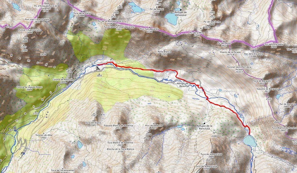 La ruta comienza en el aparcamiento de la entrada del Valle de Estós, y transcurre inicialmente por una cómoda pista (GR-11) que asciende suavemente, paralela al Río Estós, bajo la sombra de algunos pinos y hayas.