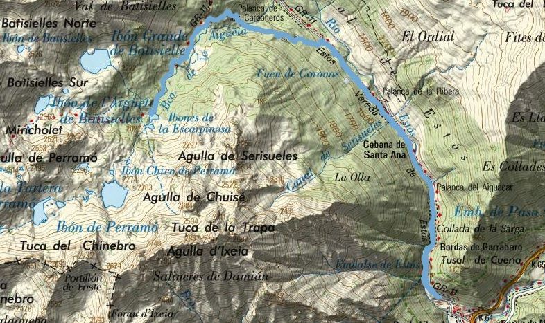 La ruta comienza recorriendo el Valle de Estós, por la pista paralela al río. Una vez superada la Cabaña de Santa Ana y la Fuente de Coronas, hay que reparar en el desvío hacia la izquierda, del que surge el sendero S3, en ascenso decidido.