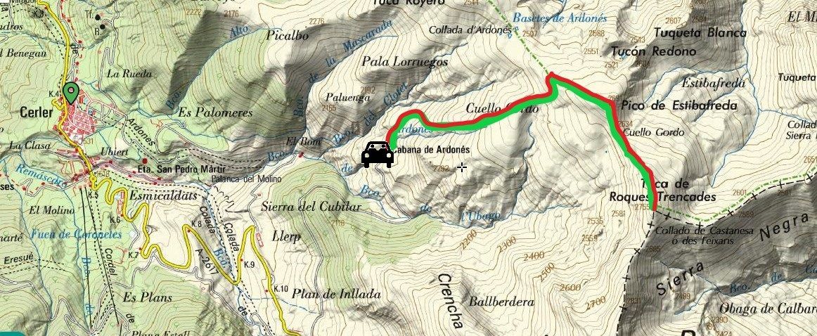 En la carretera que parte desde Cerler hasta las pistas de esquí, en el Ampriu, a la altura del km 11 parte una pista en estado aceptable para turismos que, en poco más de 3 km, finaliza en la Cabaña de Ardonés.