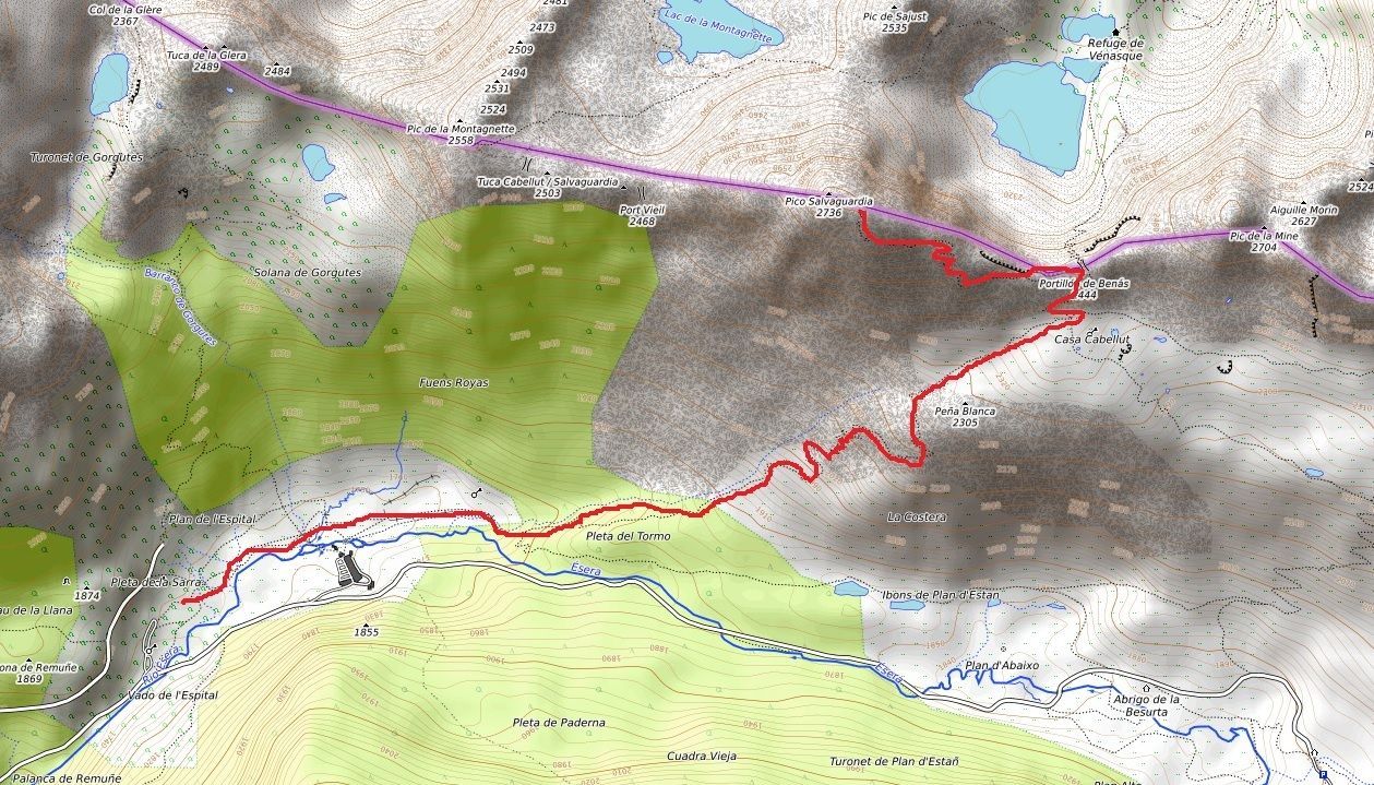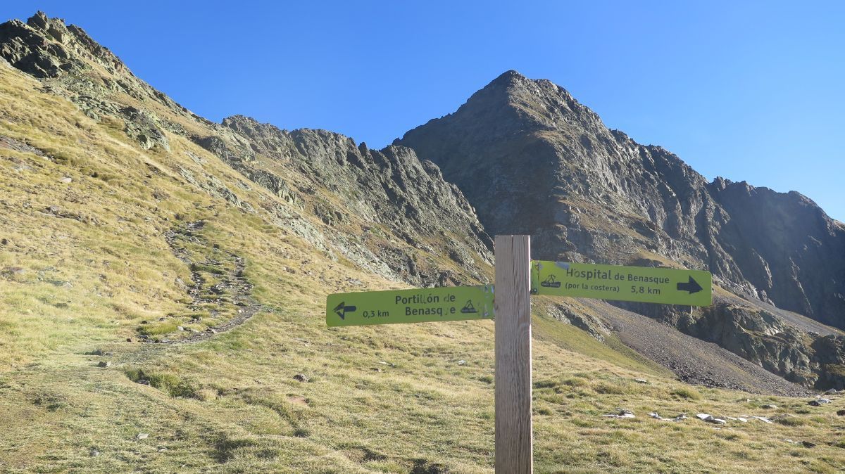La ruta comienza en el aparcamiento de los Llanos del Hospital, para comenzar por el fondo del valle y pronto tomar un desvío a la izquierda, bien señalizado, hacia el Portillón. Tramo de ascenso continuado a partir de aquí, con vistas cada vez mejores de las cumbres de los alrededores. Tras algo menos de dos horas se alcanza el Portillón de Benás (2444 m), paso fronterizo labrado en la roca.