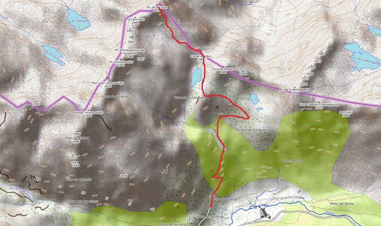 La excursión parte del final de la carretera A-139, ascendiendo por un tramo boscoso y, posteriormente, más abierto, hasta llegar a el Ibón de Gorgutes (1 hora y 20 minutos). En ascenso ya más suave se alcanza pronto el Puerto de la Glera, lugar de paso a la vertiente francesa.