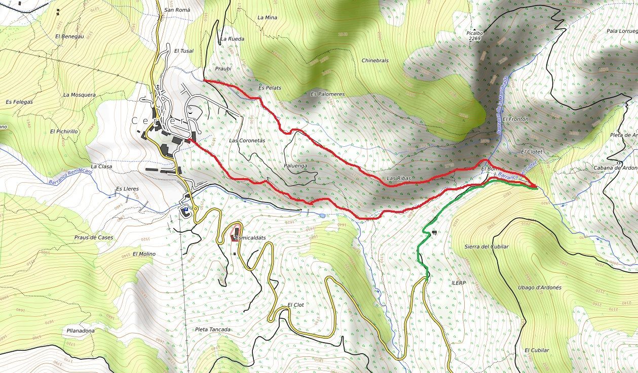 – La completa parte de la población de Cerler/Sarllé, siguiendo un recorrido perfectamente balizado que asciende por el Barranco de Remáscaro, primero por zona de vegetación y luego por una zona más abierta, con una estampa de postal al contemplar las cascadas al fondo. En aproximadamente una hora y media se alcanza la base de la Cascada de Ardonés, que suele bajar con bastante caudal. Precaución al cruzar el puente que atraviesa el río, pues suele estar mojado y resbaladizo. Además, a lo largo de la ruta se puede presenciar la Cascada del Clotet y la de Mascarada, más pequeñas pero igualmente bonitas. El regreso se puede realizar por el mismo camino o descender por la otra margen del Barranco de Ardonés, realizando una ruta circular.