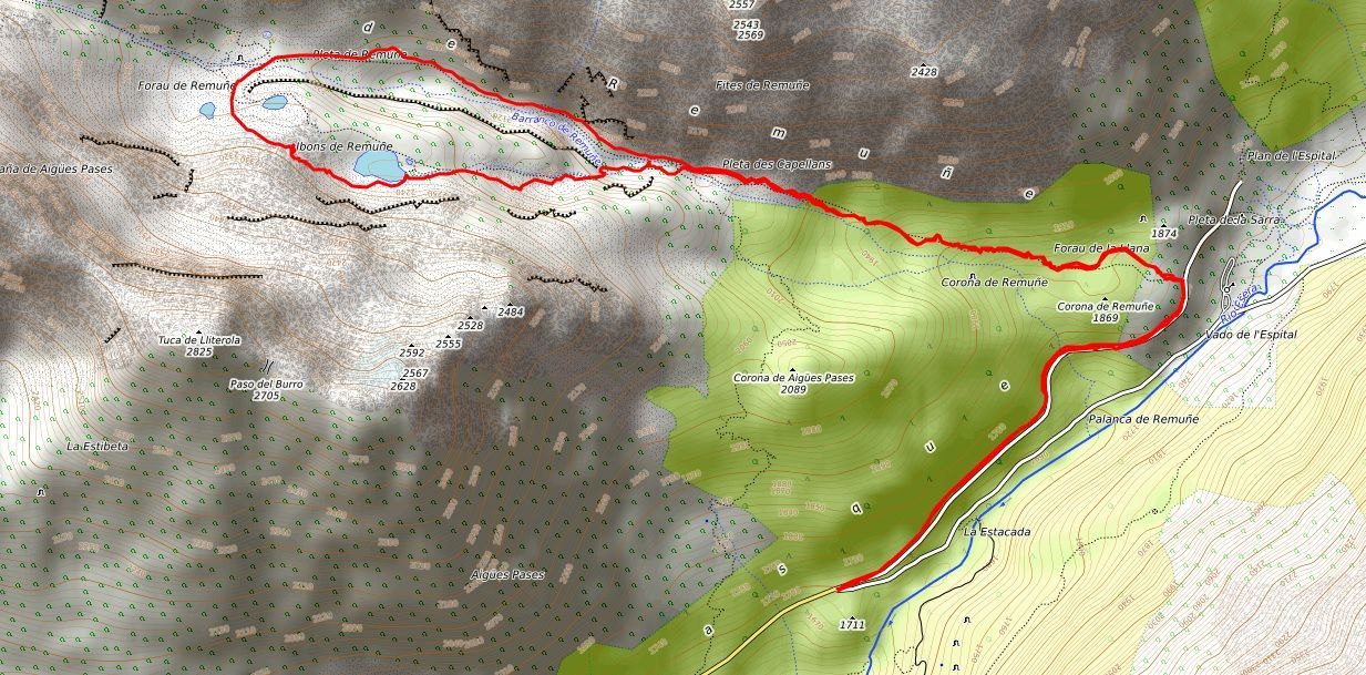 El camino va ascendiendo por el valle, a ratos estrecho y umbrío, junto al Barranco de Remuñe. En un amplio llano encontramos un desvío que permite realizar una ruta circular, ascendiendo primero al más grande de los ibones (si tomamos el desvío hacia la izquierda) y llegando, posteriormente, a los dos superiores. El camino de regreso se puede realizar por la margen izquierda del barranco, obteniendo así una vista diferente del valle.