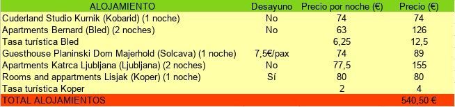 – Alojamientos: no son especialmente caros los alojamientos en Eslovenia, pero hay que mirar bien. Nos pareció que la oferta de hoteles no era tan amplia como en otros países, siendo los apartamentos una opción mucho más variada y con mayor disponibilidad. Los precios no bajan, eso sí, de 75-80€ por noche. A tener en cuenta que tanto en Ljubljana como (sobre todo) Bled, los alojamientos bien situados son caros. En temporada alta los precios se disparan y, a modo de ejemplo, una cama en una habitación compartida en un hostel a las afueras de Bled cuesta más de 60€ por persona y noche. En las proximidades de Bled hay muchos apartamentos/casas rurales de precios más moderados y muy encantadores, que pueden ser buena opción. Detallaremos todos nuestros alojamientos en otra entrada del blog; en total nos gastamos 509€ (más 16,5€ de tasas turísticas) por 7 noches. A ello hay que sumarle 15€ del excelente desayuno que disfrutamos en la Guesthouse Planinski dom Majerhold.
