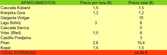– Entradas: a pesar de que muchos de los lugares a visitar en Eslovenia son parajes naturales, en muchos de ellos hay que pagar entrada. Y, en general, los precios de las entradas a los diversos lugares nos parecieron algo caros. Por ejemplo, visitar una cascada cuesta, al menos, 4€ por persona. A ello hay que sumar el precio de los aparcamientos, que en muchos de estos lugares no va incluido y es tan caro o más como la propia entrada (ver siguiente apartado). En total, el presupuesto para entradas fue de 190€.