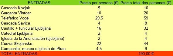 El grueso del presupuesto en un viaje como el que planteamos nosotros (por libre, recorriendo el país en coche de alquiler) va a ser, evidentemente, los vuelos, los alojamientos y el propio coche de alquiler. Sin embargo, en el caso de Eslovenia, el precio de las entradas a los sitios turísticos nos pareció (habitualmente) caro, debiendo pagar entrada incluso para acceder a espacios naturales que en cualquier otro lugar serían gratuitos. Además, los aparcamientos de las zonas turísticas son también de precio elevado, pudiendo llegar hasta los 5€/hora en algunas zonas de Bled.