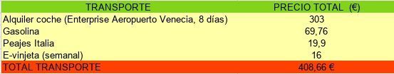 – Transporte: recorrer Eslovenia en coche es una opción más que recomendable. Se pueden alquilar vehículos en el Aeropuerto de Ljubljana y en las principales poblaciones turísticas del país. Los precios parten de los 37€ por día (coche más básico, sin seguro extra…) en temporada alta. Si se opta por volar a aeropuertos de otros países y alquilar el coche allí, los precios pueden variar (similares en Croacia, un poco más caros en Italia), por lo que conviene sacar cuentas y ver lo que más interesa. La gasolina en Eslovenia tiene precios similares a España (en torno a 1,5€ el litro), si bien es cierto que dado el pequeño tamaño de Eslovenia, no se van a recorrer demasiados kilómetros y el monto total en gasolina no va a ser demasiado relevante. Finalmente, no hay que olvidar que para poder circular por las carreteras de peaje de Eslovenia es preciso adquirir la e-vinjeta (16€ una semana, 32€ un mes). En nuestro caso alquilamos el coche en el Aeropuerto de Venecia por 303€ (8 días), a lo que hay que sumar 69,76€ de gasolina, 19,9€ de peaje en carreteras italianas y los 16€ de la e-vinjeta. En total, fueron 408,66€.
