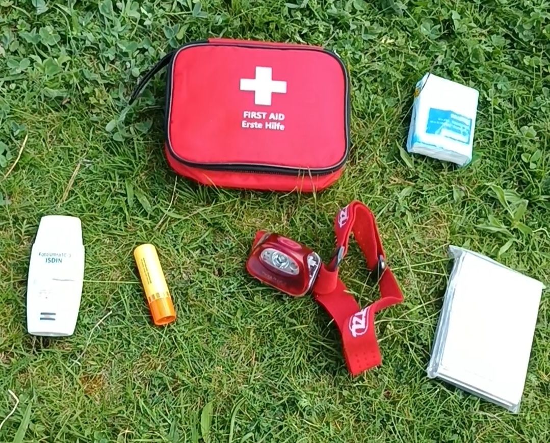 – Botiquín de montaña: de igual manera que la mochila, debe ser reducido, pero sin que falte nada de lo imprescindible. El contenido del mismo se debe adaptar a la duración de la ruta, pero debería incluir al menos: analgésicos/antiinflamatorios (paracetamol, ibuprofeno), povidona yodada (Betadine) u otro antiséptico, tubitos pequeños de suero fisiológico, gasas estériles, tiras de aproximación, tiritas, esparadrapo, vendas compresivas, tijeras y una pinza pequeña. Las pastillas potabilizadoras de agua pueden ir también en el botiquín. Además, es imprescindible llevar una manta térmica para abrigarnos en caso de accidente. Resulta interesante realizar algún curso de primeros auxilios (hay algunos específicos de montaña/actividades al aire libre, incluso online) para formarse en la preparación y uso de un botiquín de montaña.