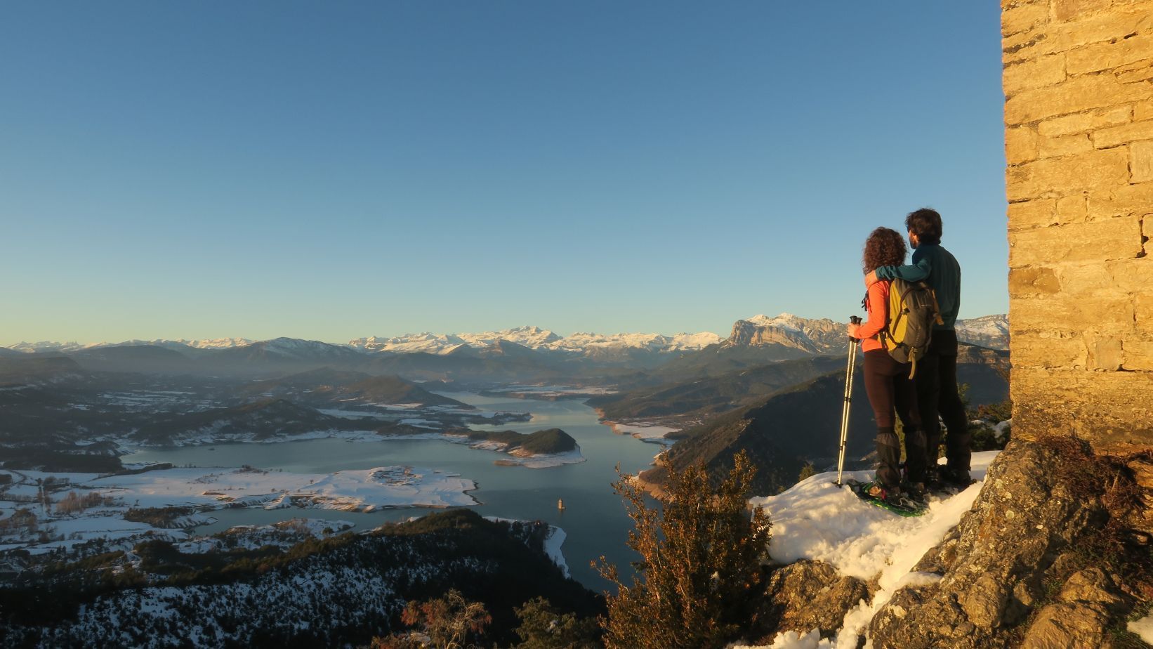 La última foto está hecho desde el Castillo de Samitier, en la Comarca del Sobrarbe, justo tras la tormenta Filomenta, en que pudimos subir allí con raquetas de nieve. Te dejamos el enlace con la excursión a ese lugar que, sin duda, es un excelente mirador.
