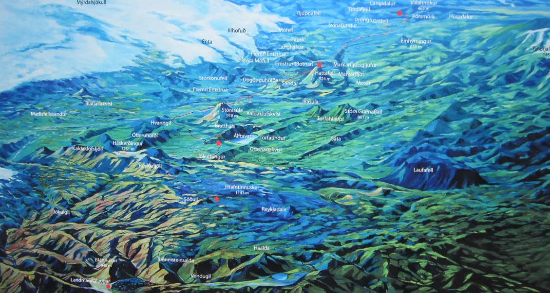 | Mapa en 3D, al inicio de la ruta. En la esquina inferior izquierda nuestro punto de partida (Landmannalaugar); en la esquina superior derecha el punto de llegada (Þórsmörk). |