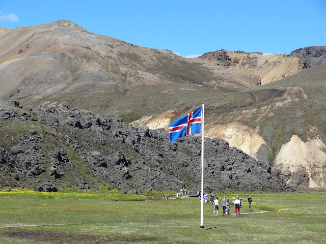| La bandera islandesa nos recibe en la zona de aguas termales de Landmannalaugar. |
