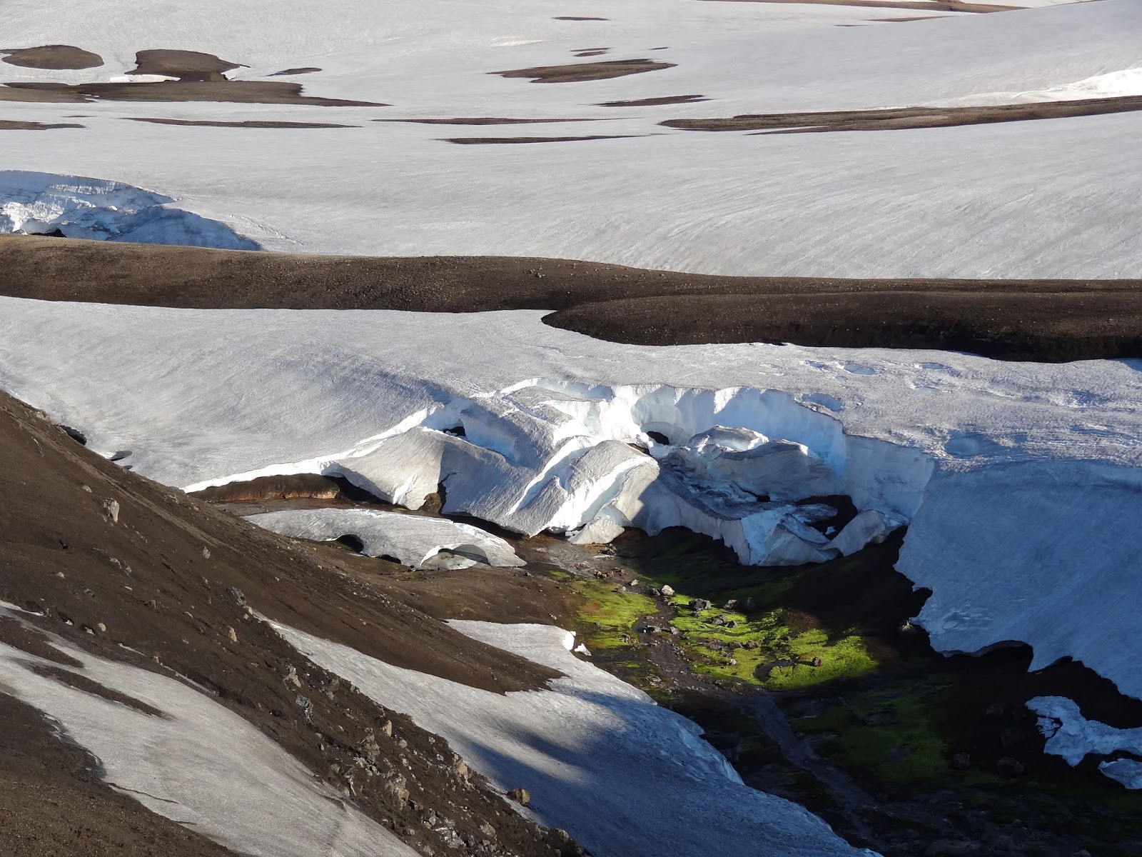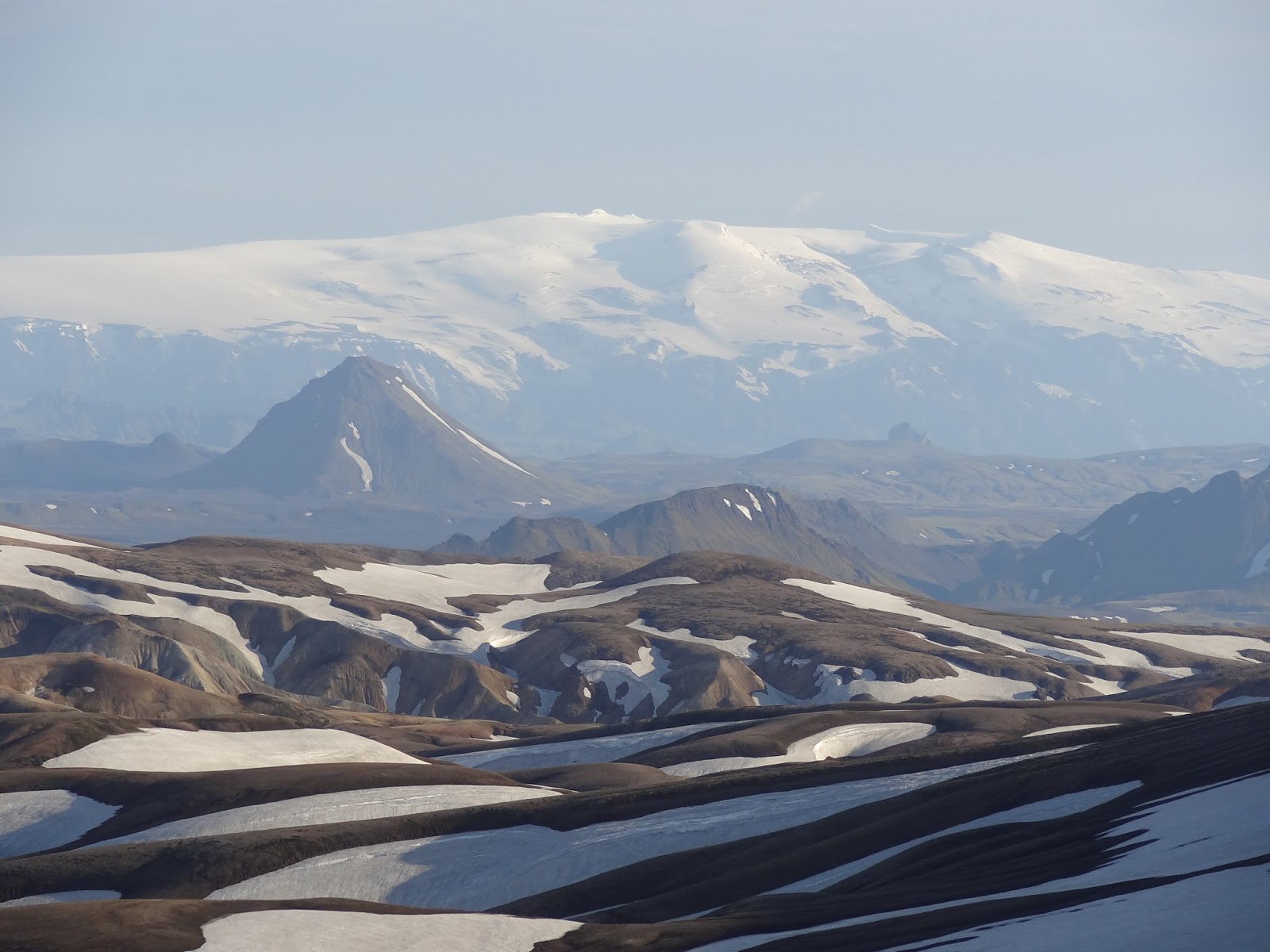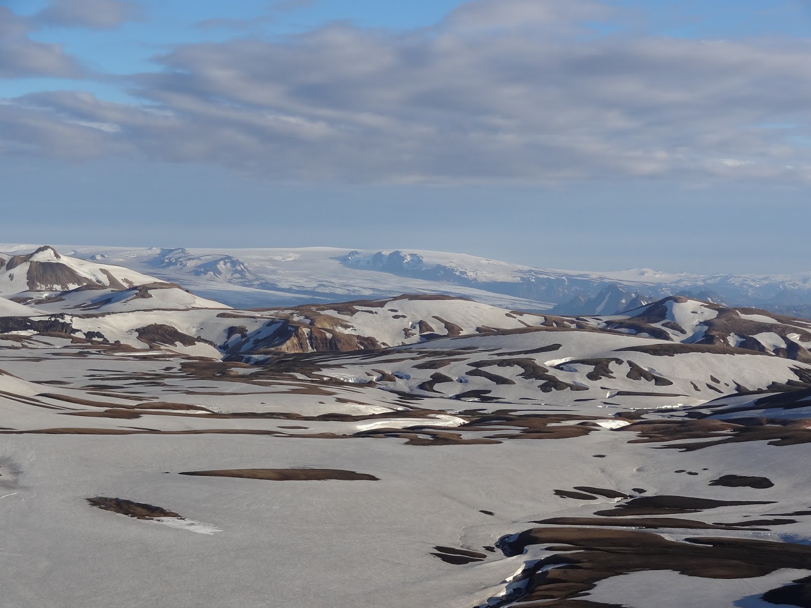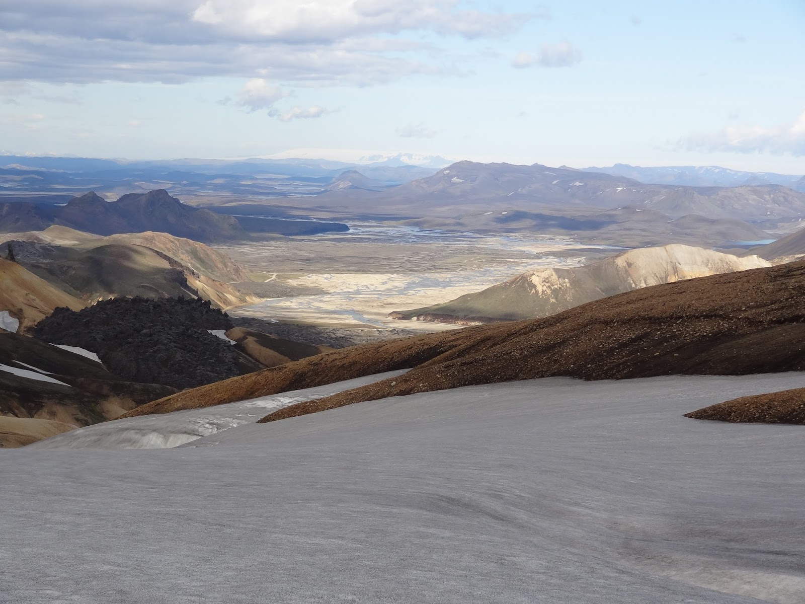 Pisando ya la nieve, sin grandes pendientes y carente de dificultad. A la izquierda se observa el campo de lava de Laugharaun y, al fondo, las llanuras de Landmannalaugar.