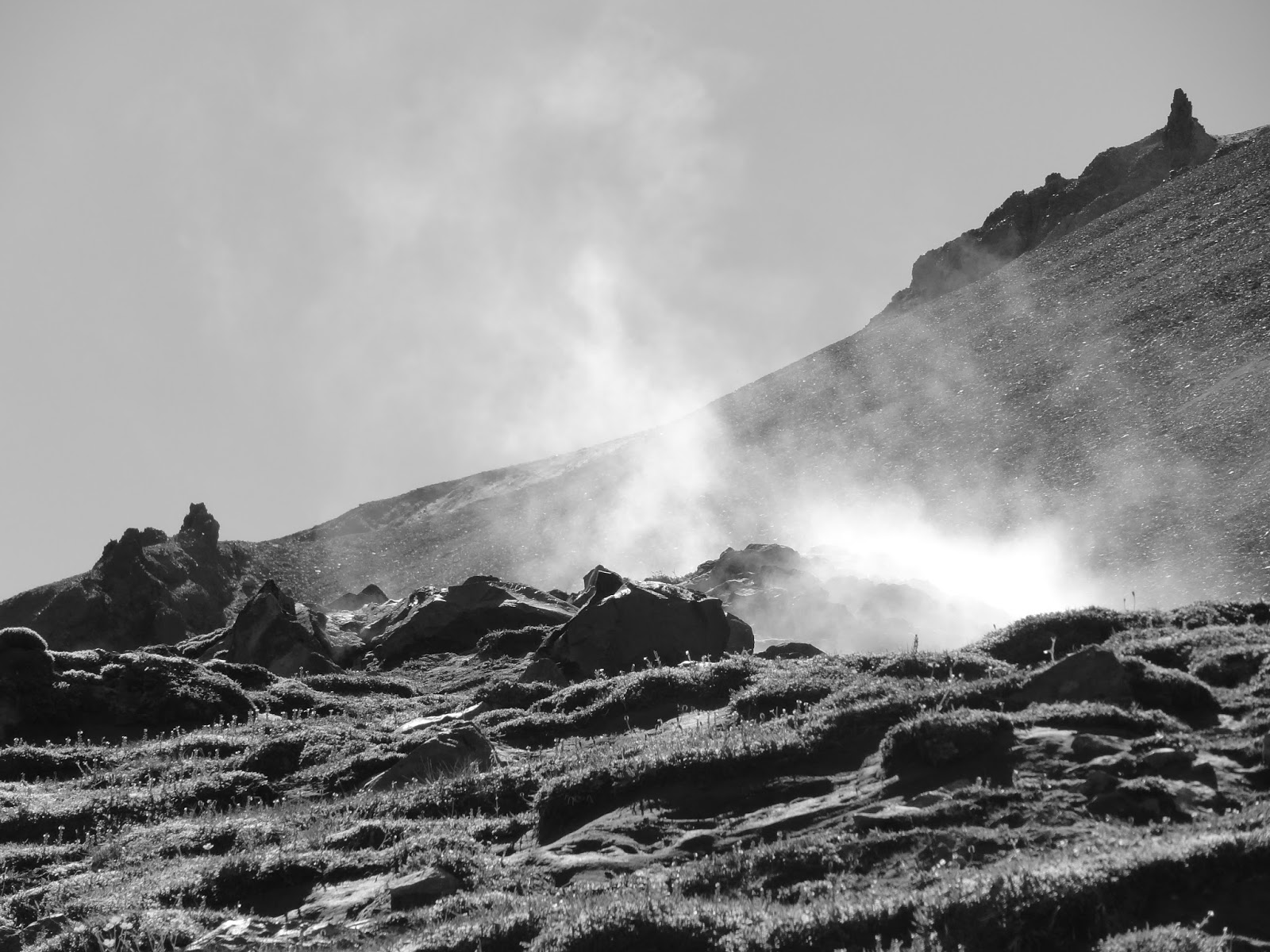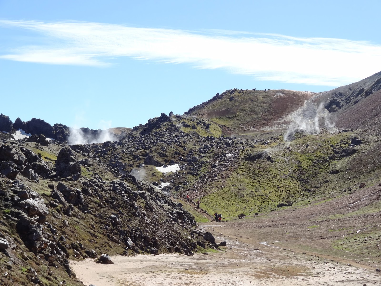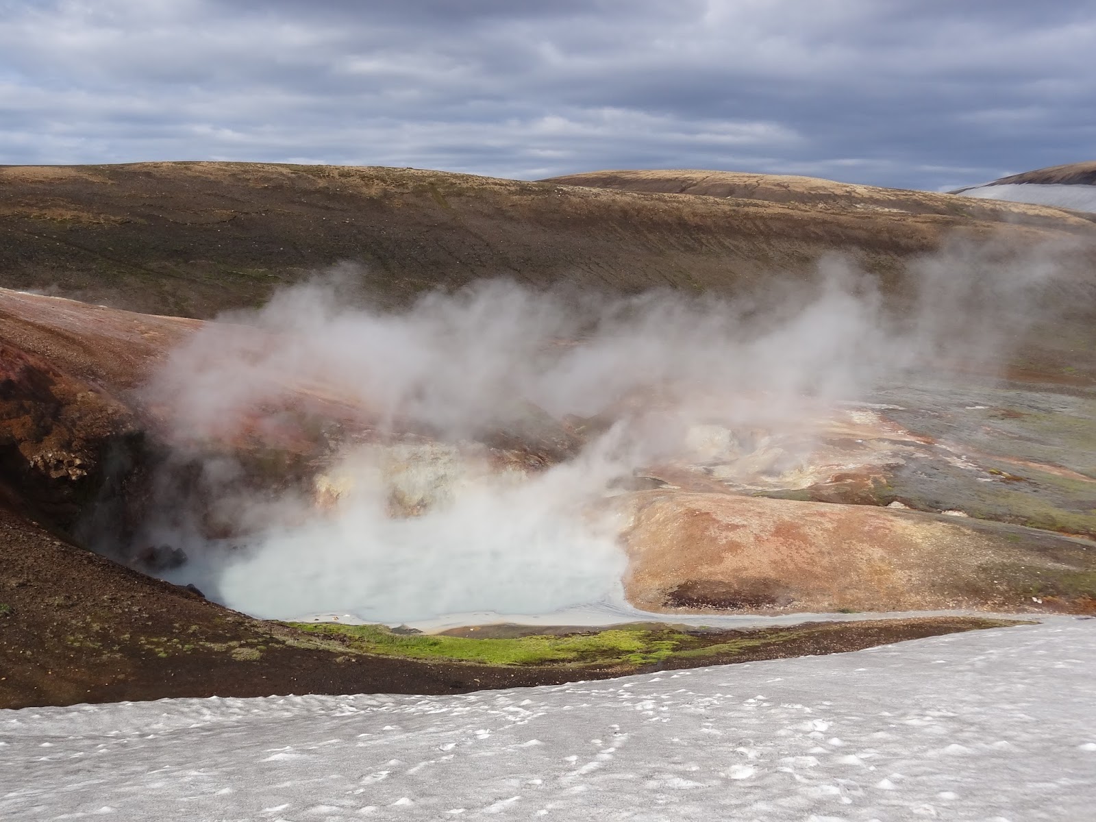 Tras unas 3 horas de marcha a ritmo tranquilo y deleitándonos con los paisajes de nuestro alrededor llegamos a la zona de Storihver. Se trata del vado de un río en el que se concentra una gran actividad geotérmica. Fruto de ello, numerosas fumarolas desprenden vapor de agua provocando un ruido ensordecedor, e impregnan el aire de un característico aroma a azufre.