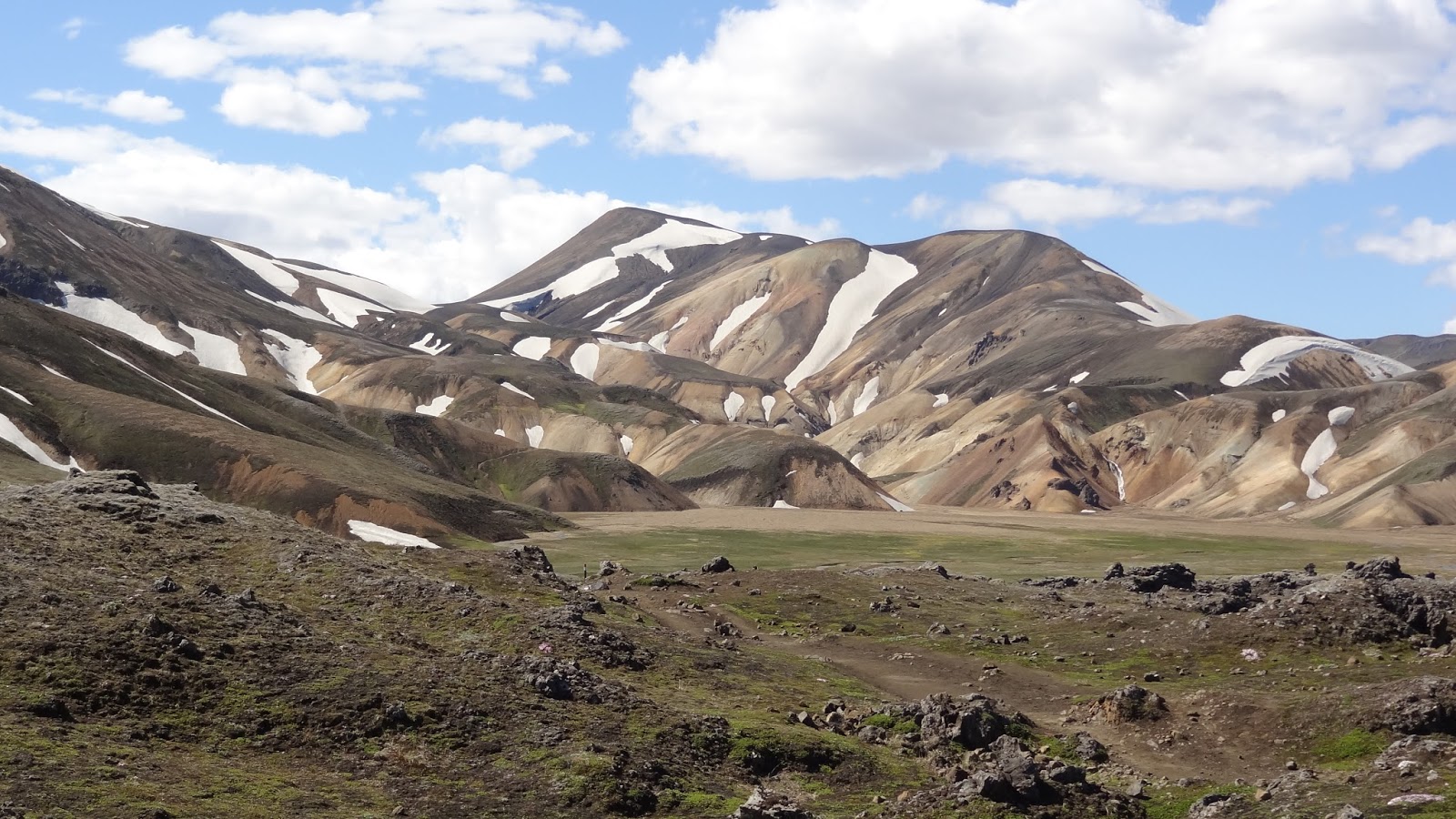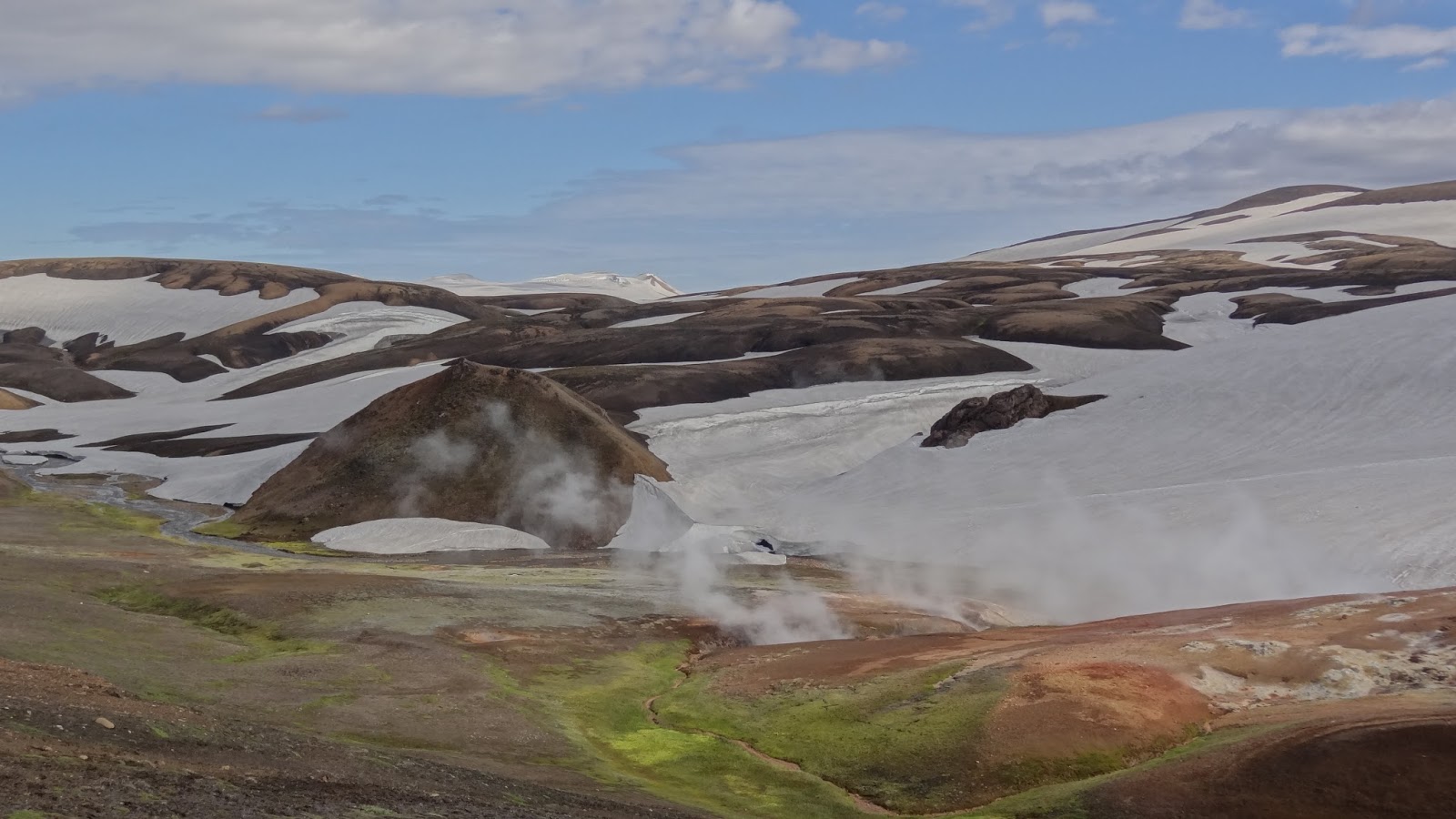 Son las tres de la tarde y en Landmannalaugar luce un sol radiante, lo que nos otorga una temperatura agradable. A nuestro alrededor ya apreciamos pequeñas colinas verdes y ocres, con restos de la nieve que cubrió todo en los meses anteriores.