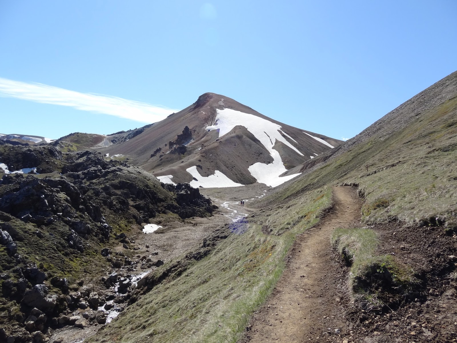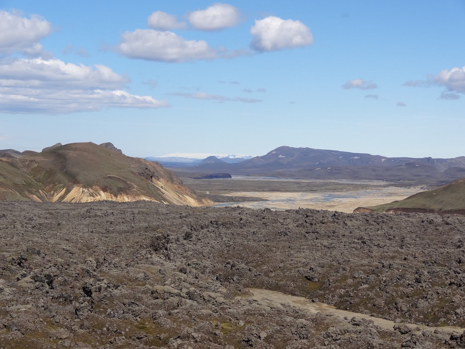Aproximadamente a los 40 minutos del inicio la senda vira a la izquierda, y adquiere de nuevo cierta pendiente para ascender, por una zona de fumarolas, al campo de lava de Laugahraun, donde se aprecia con claridad el terreno por el que descendió la lava hace unos cientos de años. A nuestra izquierda se alza el Bláhnúkur, un pico majestuoso a pesar de sus escasos 850 metros de altitud.