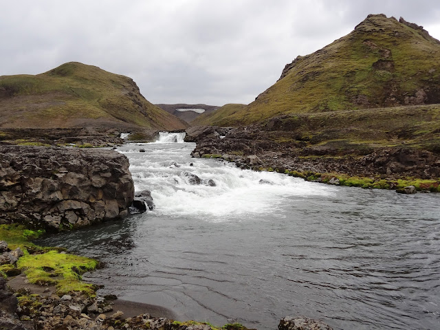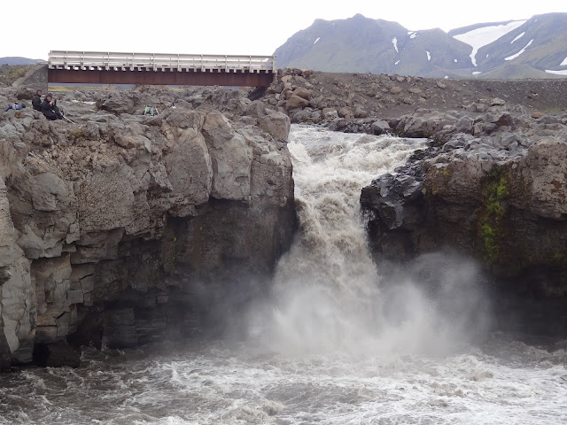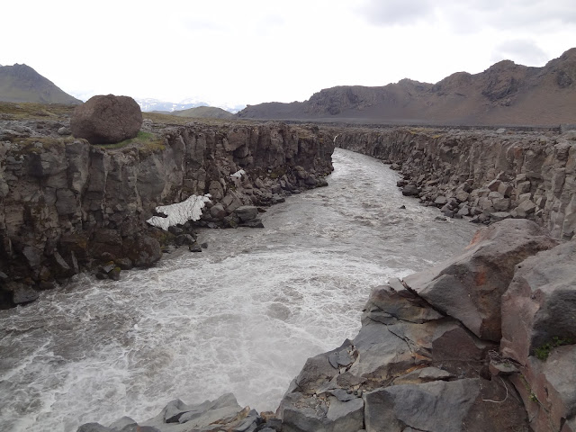 A las tres horas de marcha llegamos a uno de los puntos más espectaculares de la jornada. Se trata del poderoso río Nyrðri Emstruá, crecido por el deshielo de los glaciares. Dicho río puede ser atravesado por un puente de madera; no obstante vale la pena parar en este punto y desviarse unas decenas de metros hacia la derecha. Así, podemos contemplar la impresionante garganta que forma el río en este lugar, culminada por una estruendosa cascada. Realmente impresionante la fuerza del agua.