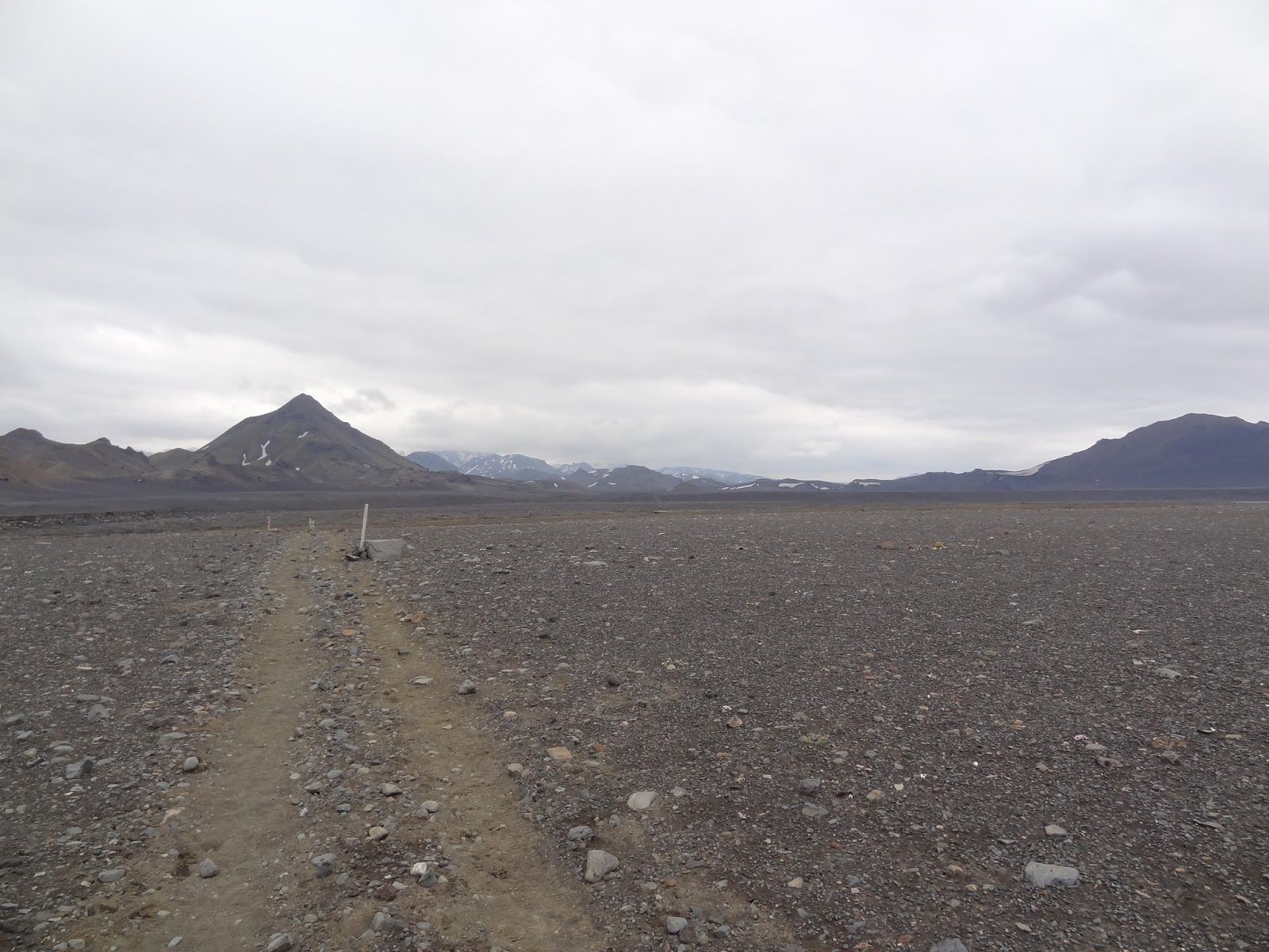 En este momento la senda llega a un inmenso desierto de arena negra. El cambio de paisaje (del verde de la zona de Álftavatn al negro de este gigantesco sandur) es impresionante, aunque este tramo se puede hacer algo monótono.