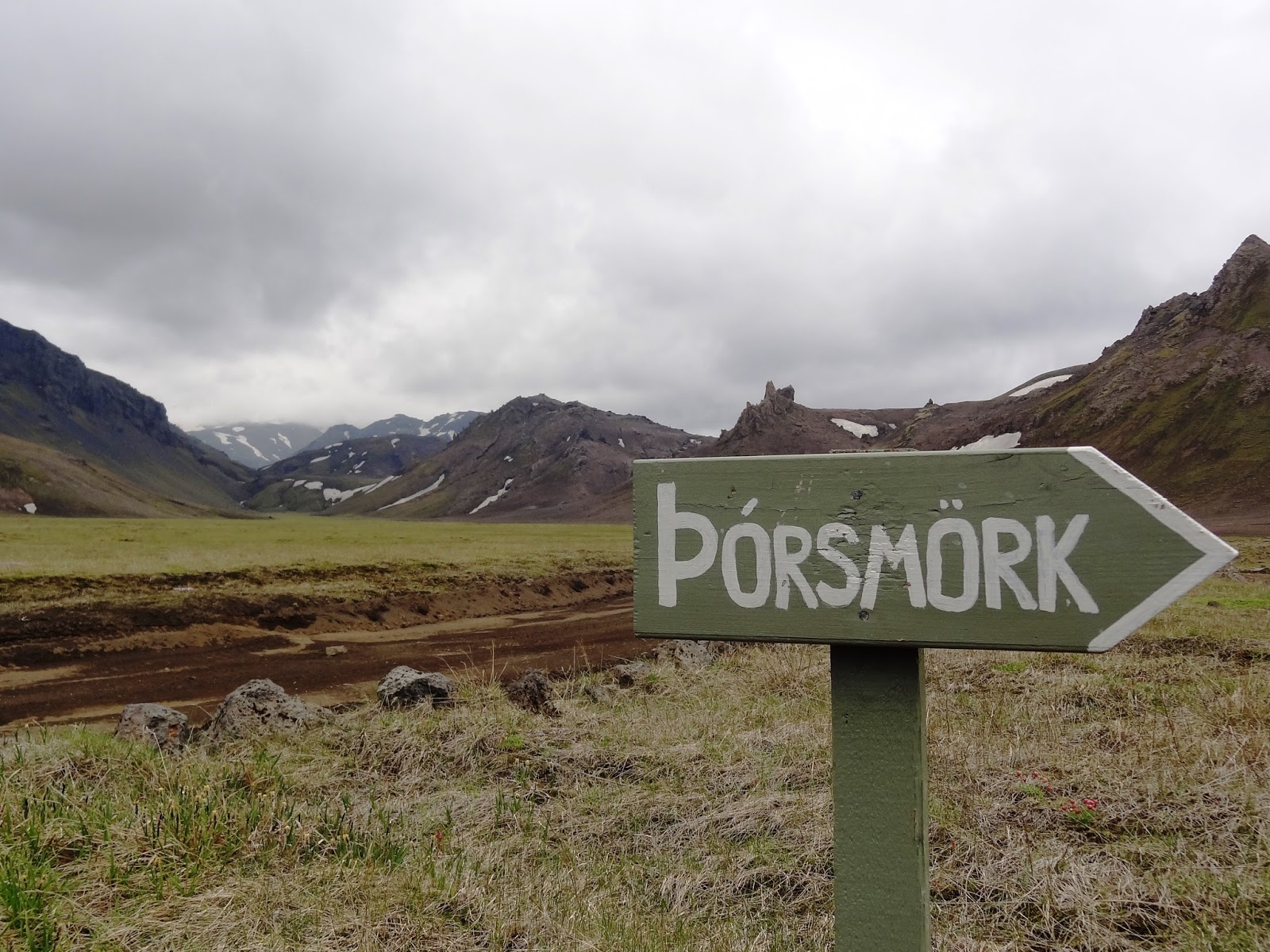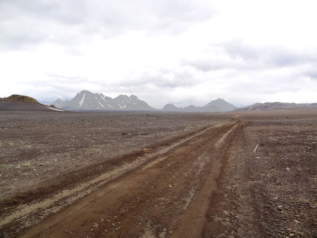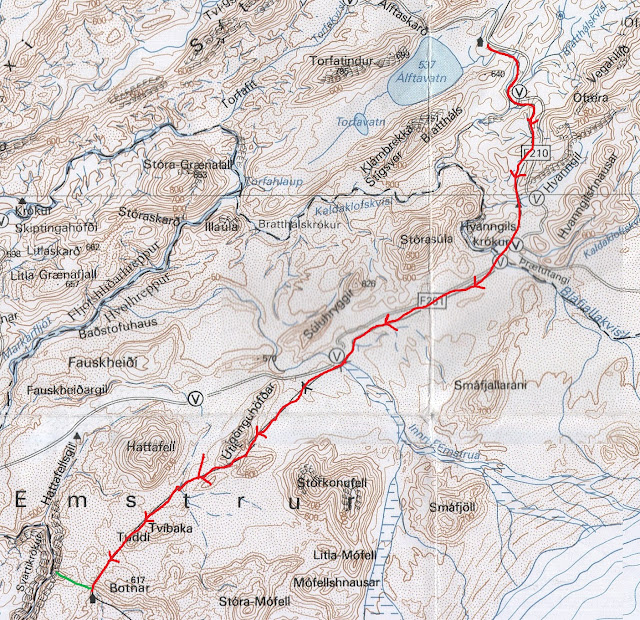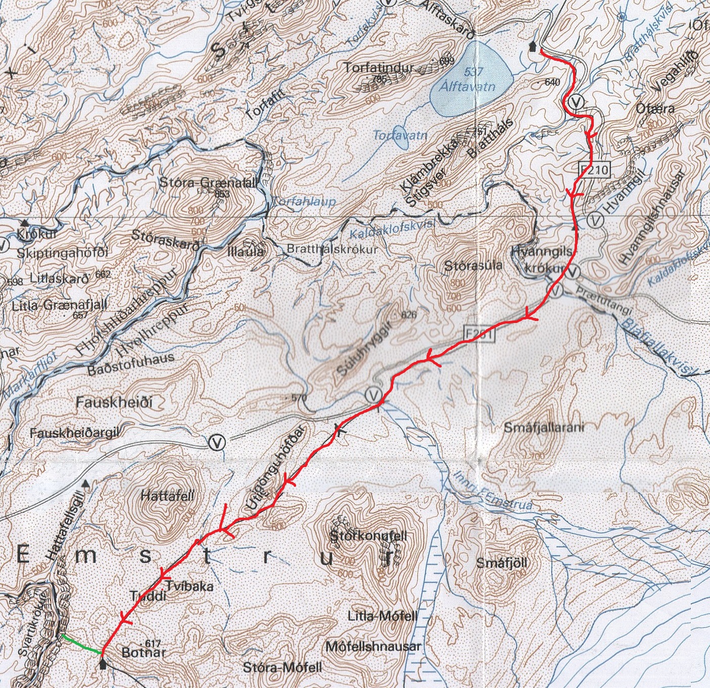 Quince minutos más allá del refugio cruzamos el río Kaldaklofskvísl por un pequeño puente de madera. Unos metros después de cruzar dicho puente encontramos un desvío que lleva en dirección este hacia Mælifellssandur (por la pista F 210); nosotros, sin embargo, debemos continuar en dirección suroeste hacia Emstrur.