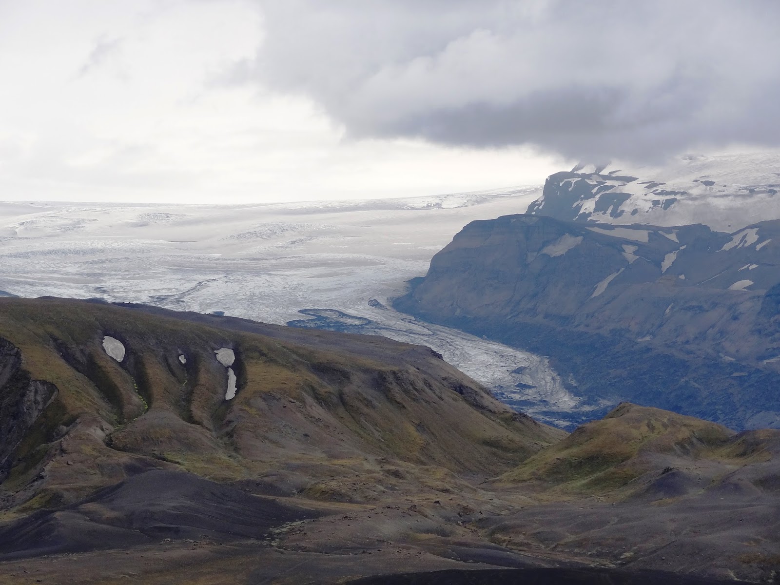 El último tramo de la jornada transcurre por una zona de arenas algo más rojizas, hasta que llegamos a una zona sobreelevada que constituye un perfecto mirador de la lengua glaciar Entujökull, perteneciente al gigantesco Mýrdalsjökull.