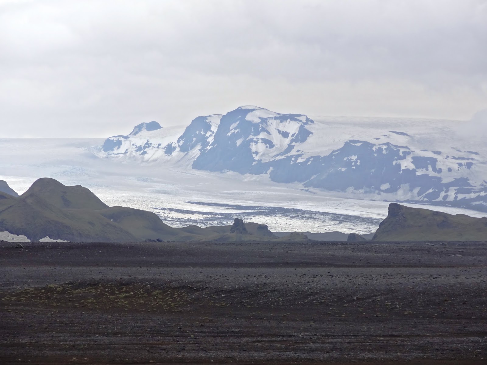 Posteriormente el camino continúa por el inmenso sandur, que ahora adquiere la característica de que a sus negras arenas se añaden montañas de tonos verdosos (como el pico Storkonufell y Utigönguhöfðar), además de blancos glaciares.