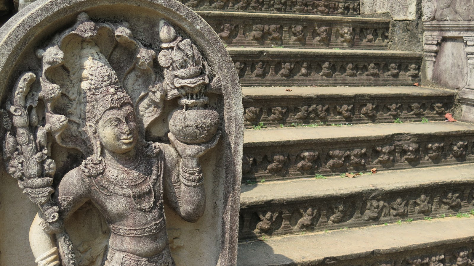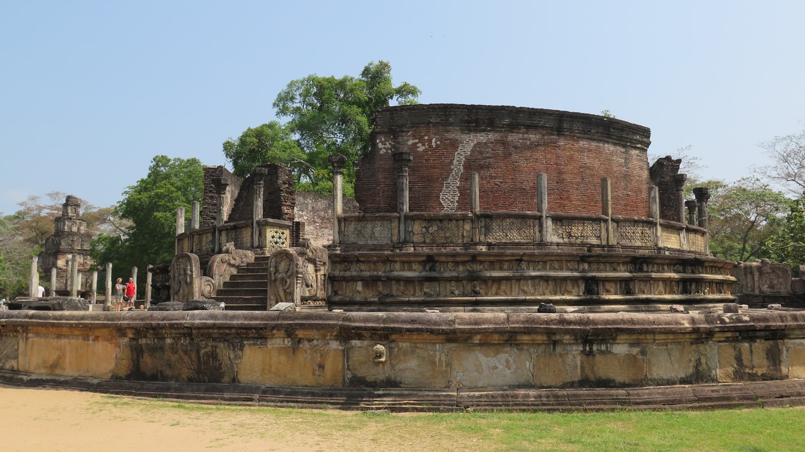 Observamos estupefactos el gran edificio del Thuparama, aunque enseguida nos dirigimos al edifico más relevante del cuadrángulo, el Vatadage. Se trata de un templo con forma circular y cuatro escaleras de acceso, con sendos budas sentados mirando hacia las entradas. El nivel de detalle en la decoración de las escaleras y los frisos del edificio es magnífico; en alguna de ellas podemos contemplar la simbólica Piedra de la Luna (que representa las distintas fases del ciclo de la vida), perfectamente conservada.