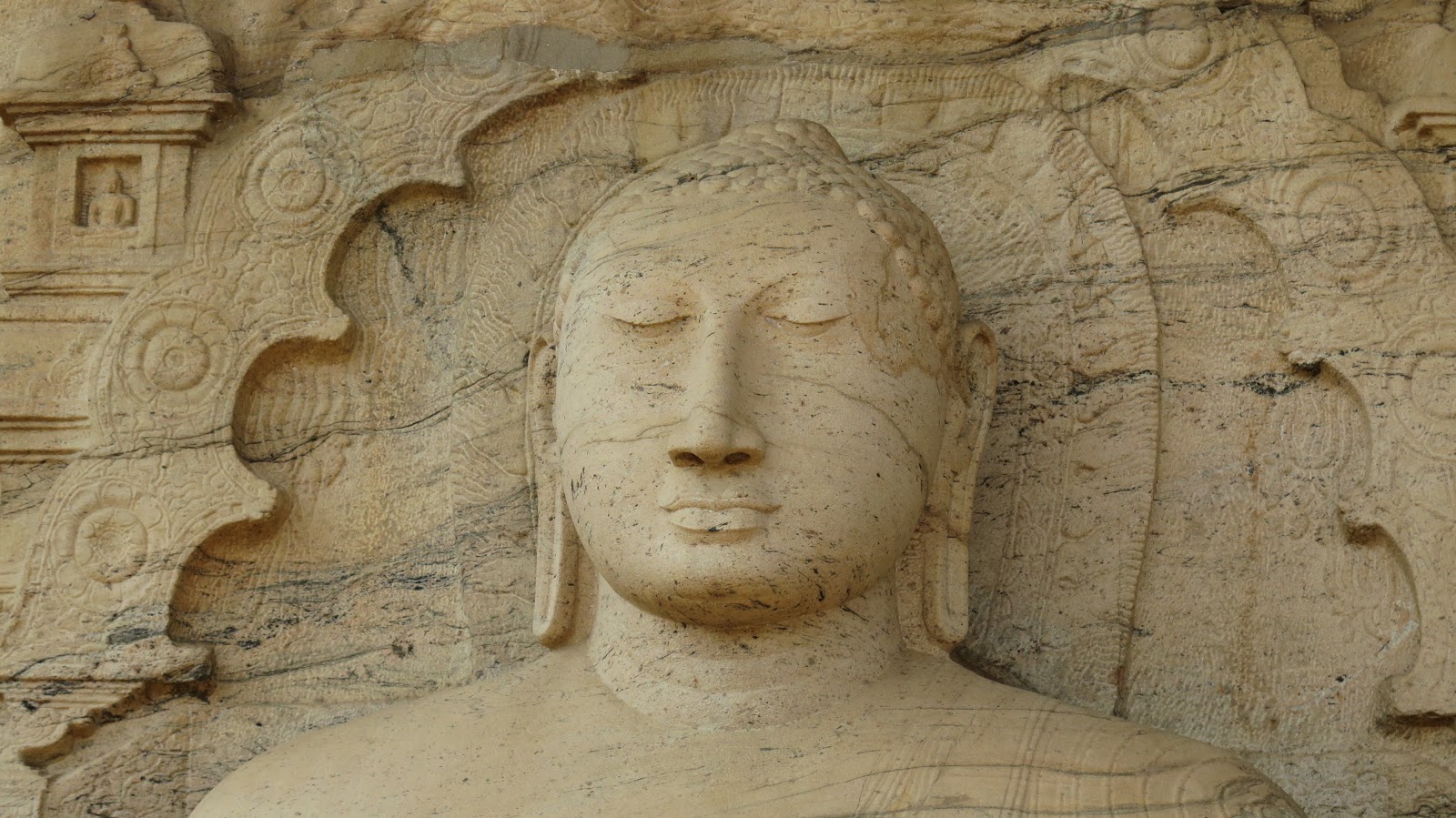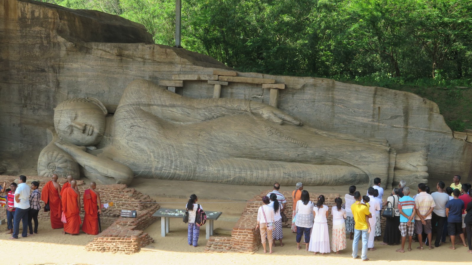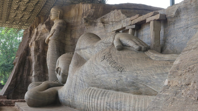 Por último llegamos a otra de las joyas de Polonnaruwa: el Gal Vihara, también conocido con el nombre anglosajón “Rock Temple”. Fue construido durante el reinado de Parakramabahu, en el siglo XII, y está formado por unas colosales estatuas de Buda talladas a la perfección en roca. La primera de ellas representa a Buda sentado, a su lado vemos otras estatuas de menor tamaño; la última de ellas es un gran Buda reclinado de más de casi 25 metros de largo. Las imágenes están talladas a la perfección, nos parece lo más bonito que hemos visitado hoy.