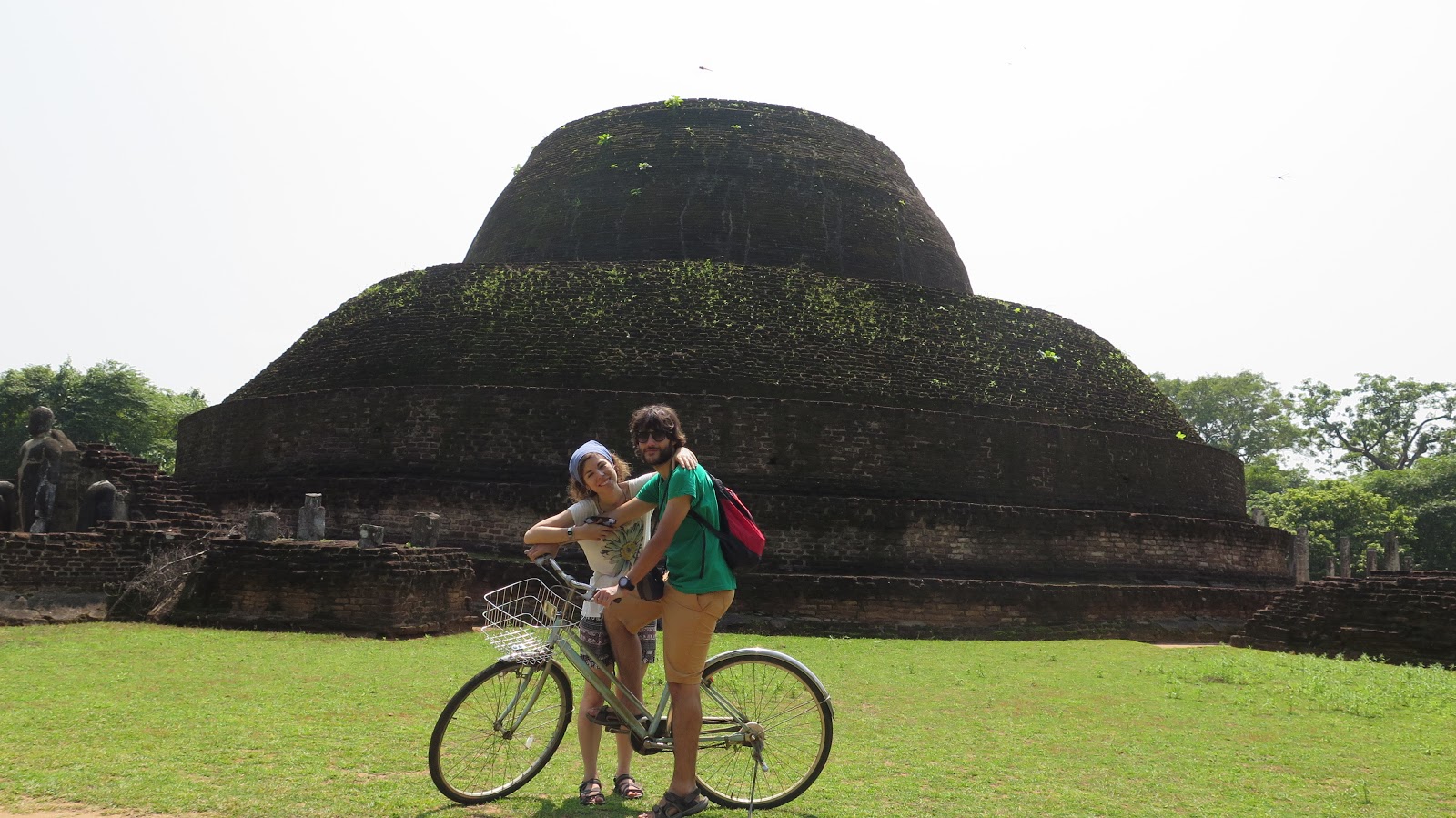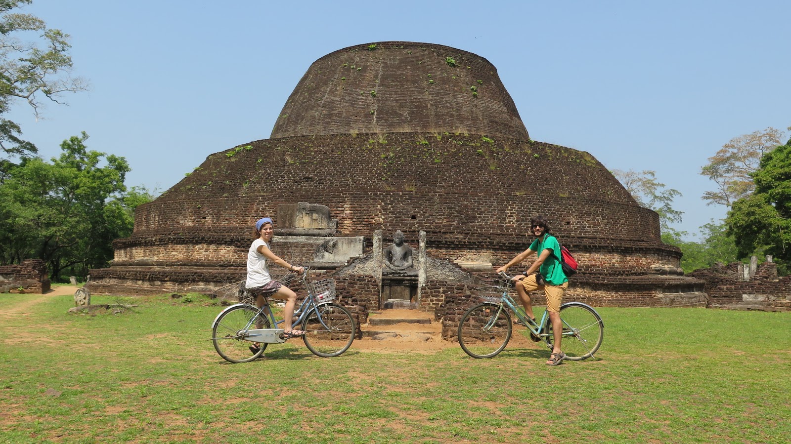 El trayecto, directo, hasta Polonnaruwa nos lleva casi una hora y media, y cuesta 90 rupias por persona. Descendemos en dicha localidad y, justo enfrente de la parada de autobús, encontramos un lugar donde alquilan bicicletas. Regateamos durante unos breves minutos hasta conseguir las 2 bicicletas por 400 rupias, no está mal. Ahora a recorrer el enorme complejo de ruinas montados en estas vetustas bicis; en un primer momento pueden resultar incómodas pero son la mejor manera de descubrir Polonnaruwa por libre.
